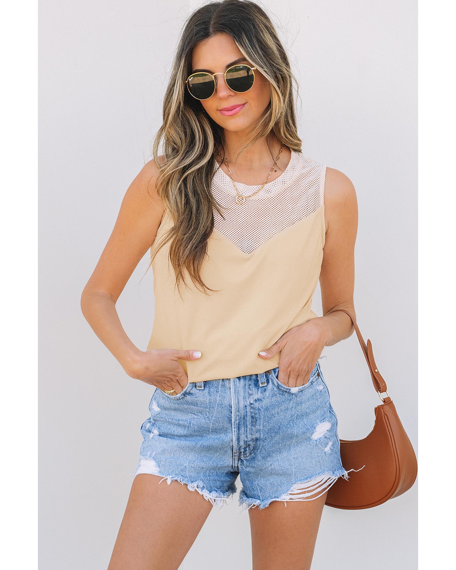 Oatmeal Solid Mesh Patchwork Crew Neck Tank Top – XL