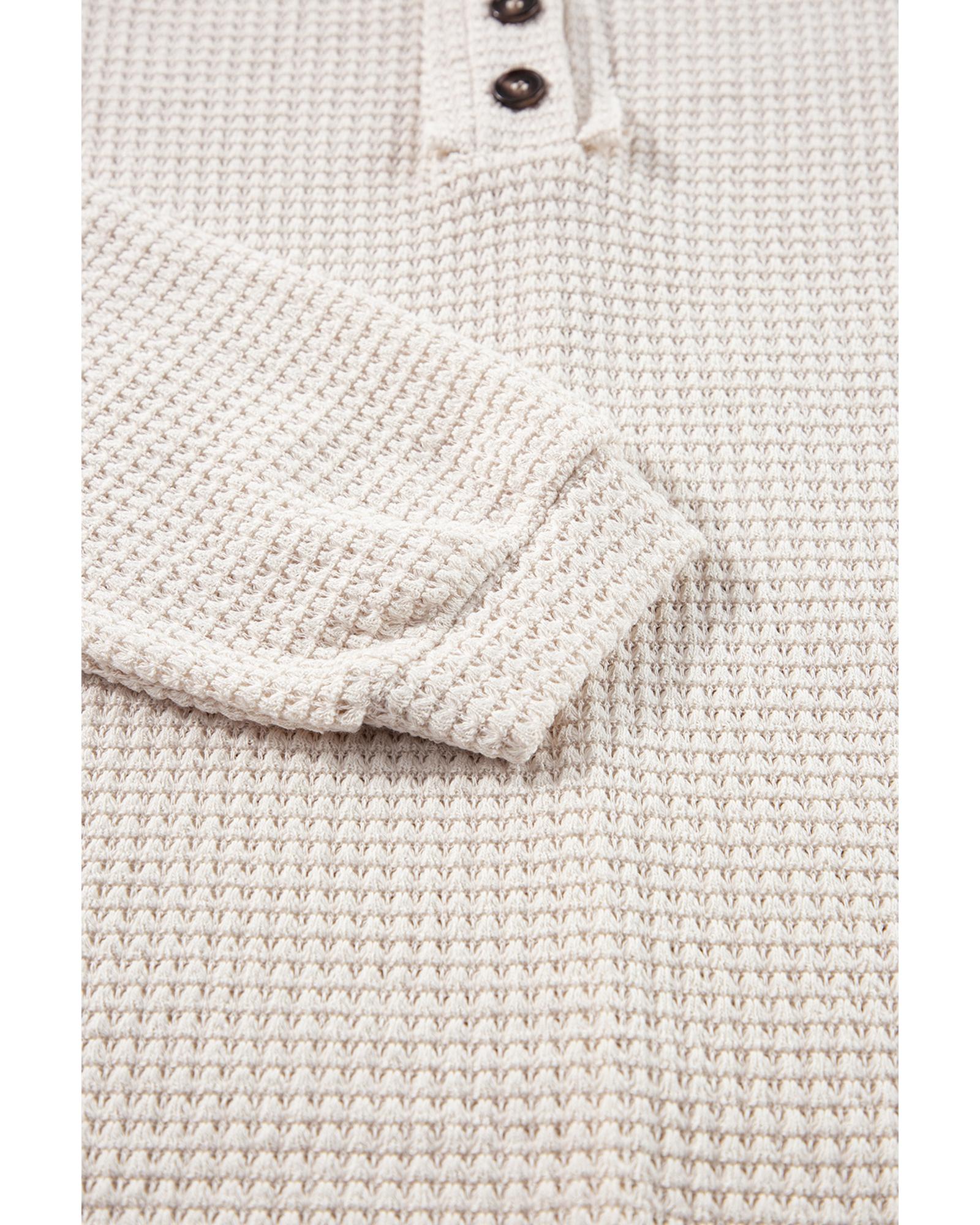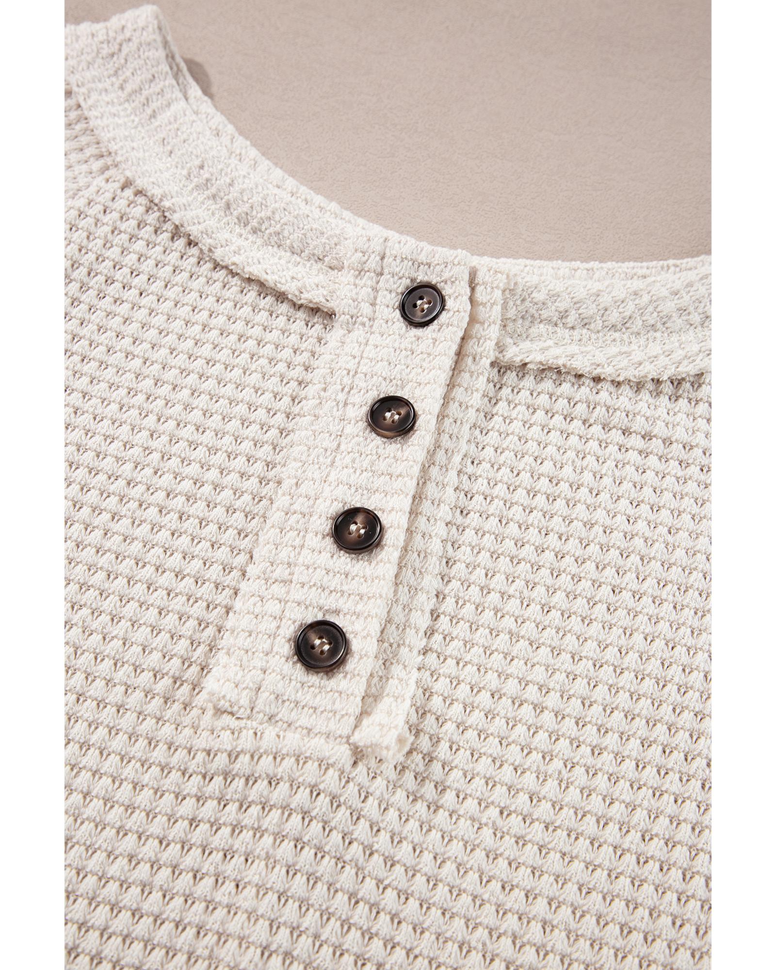 Oatmeal Waffle Knit Buttoned Front Raglan Sleeve Loose Blouse – L