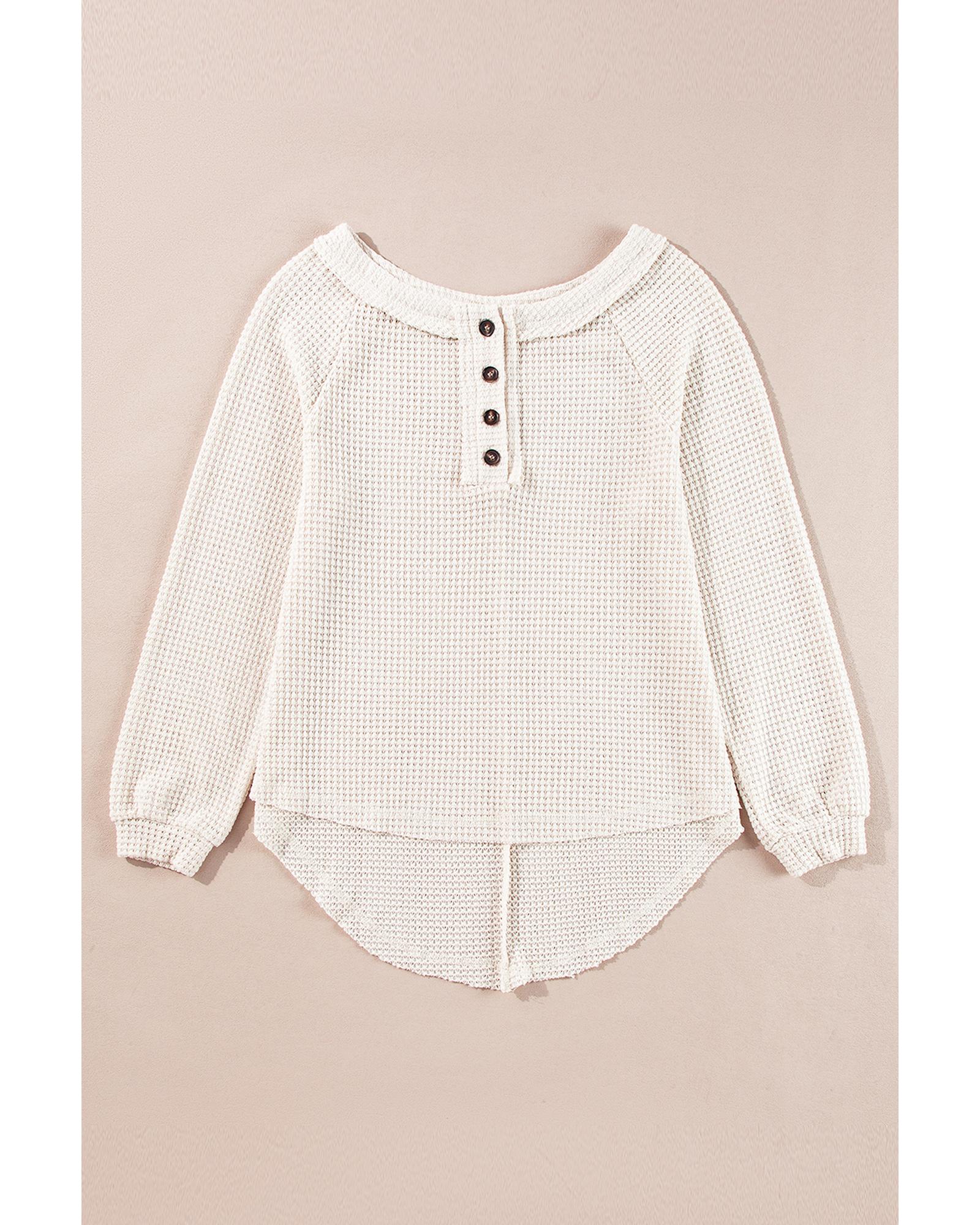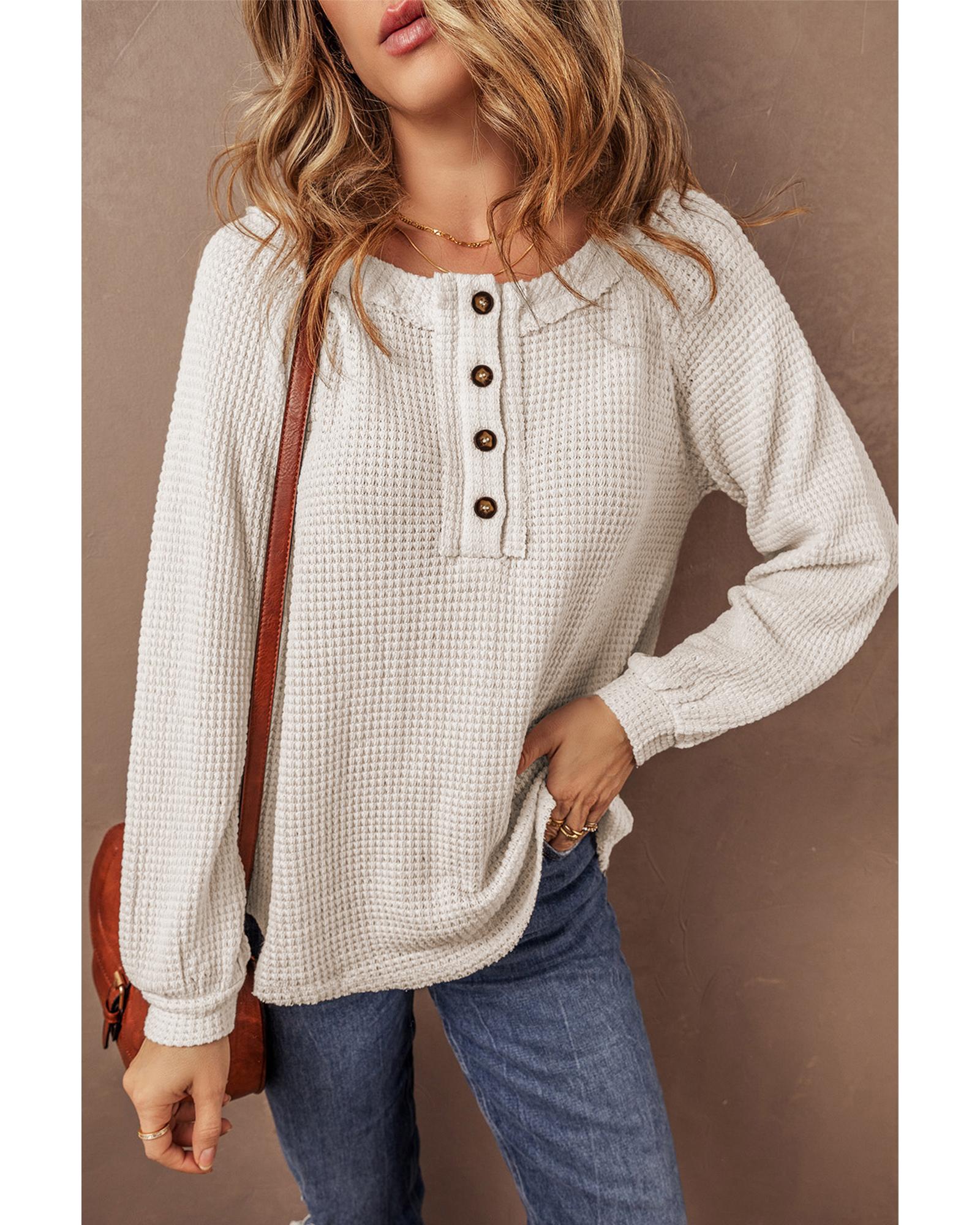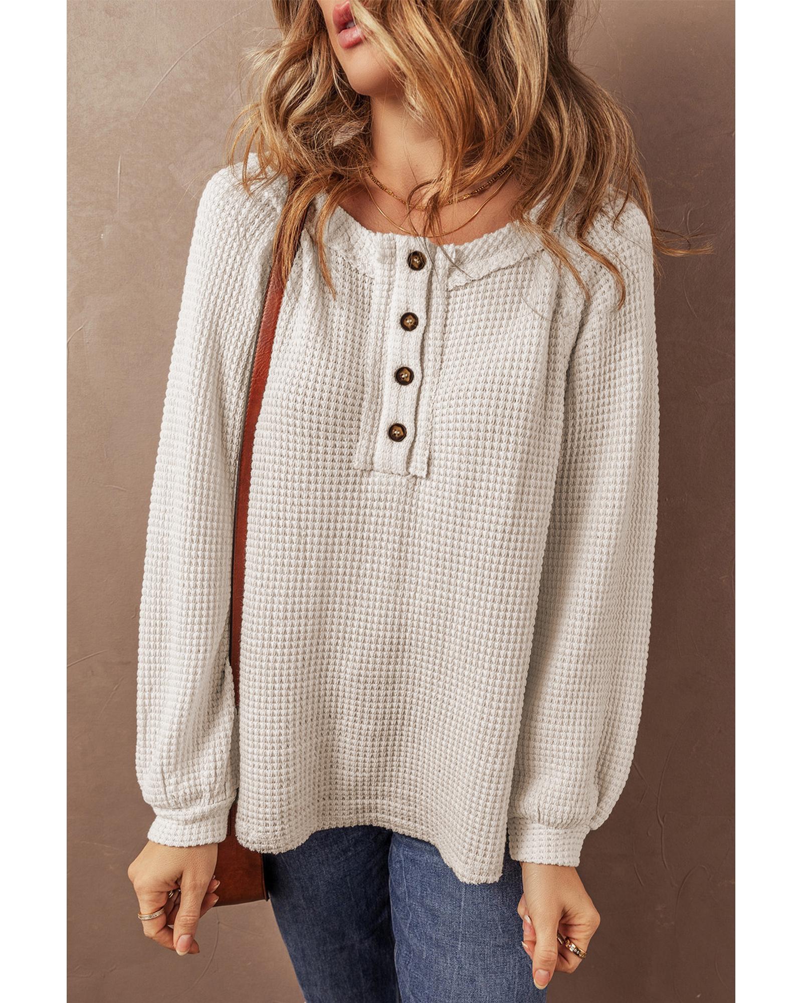 Oatmeal Waffle Knit Buttoned Front Raglan Sleeve Loose Blouse – S