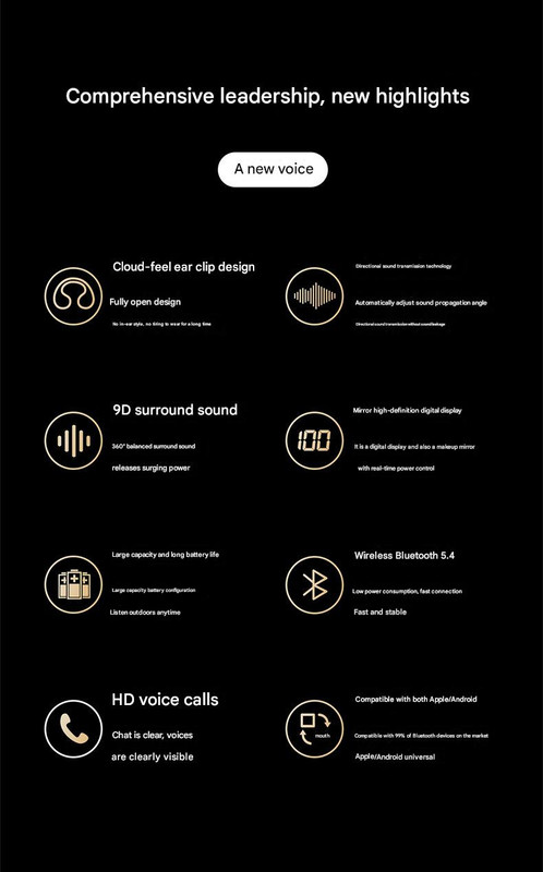 Immerse yourself in sound without sacrificing comfort or awareness with our next-generation Open-Ear Conduction TWS Earbuds. Featuring an innovative “cloud feel” ear-clip design, these earbuds rest gently on your ear, providing a painless, non-intrusive listening experience that allows you to stay connected to your surroundings while enjoying your audio. Experience stunning 9D stereo surround sound with 360-degree panoramic audio, delivered by high-quality components and a composite diaphragm for bright highs, full mids, and deep, elastic bass. The DT5.0 directional sound transmission technology ensures efficient audio delivery to your ear canal while minimizing sound leakage by up to 99%. With the latest Bluetooth 5.4 for low-latency, fast, and stable connections, a large capacity battery for extended playtime, clear HD voice calls, and a mirrored HD digital display on the charging case for real-time battery monitoring, these earbuds are perfect for sports, commuting, or everyday use. Universally compatible with 99% of Bluetooth devices, including Apple and Android systems.
