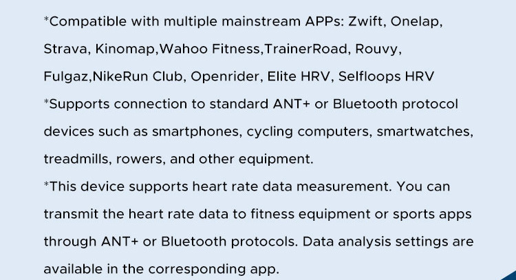 - Wide App Compatibility: Works with multiple mainstream fitness apps such as Zwift, Onelap, Strava, Kinomap, Wahoo Fitness, TrainerRoad, Rouvy, and NikeRun Club.