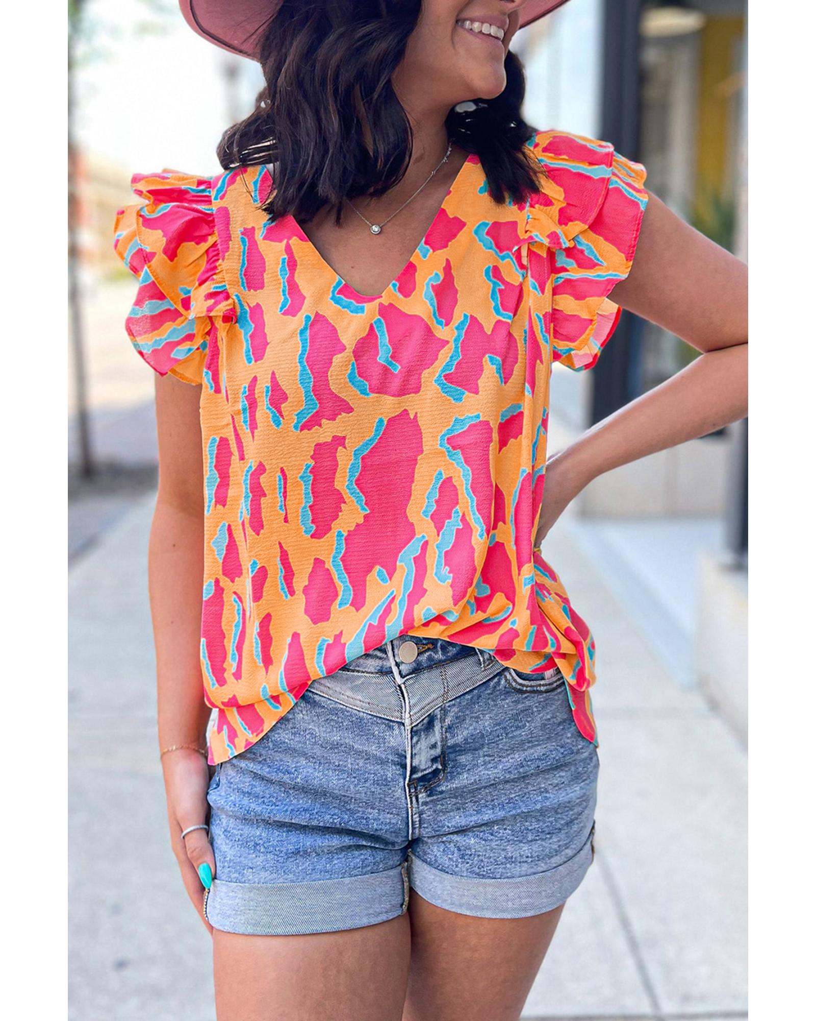Orange Abstract Print V Neck Ruffled Sleeve Blouse – S