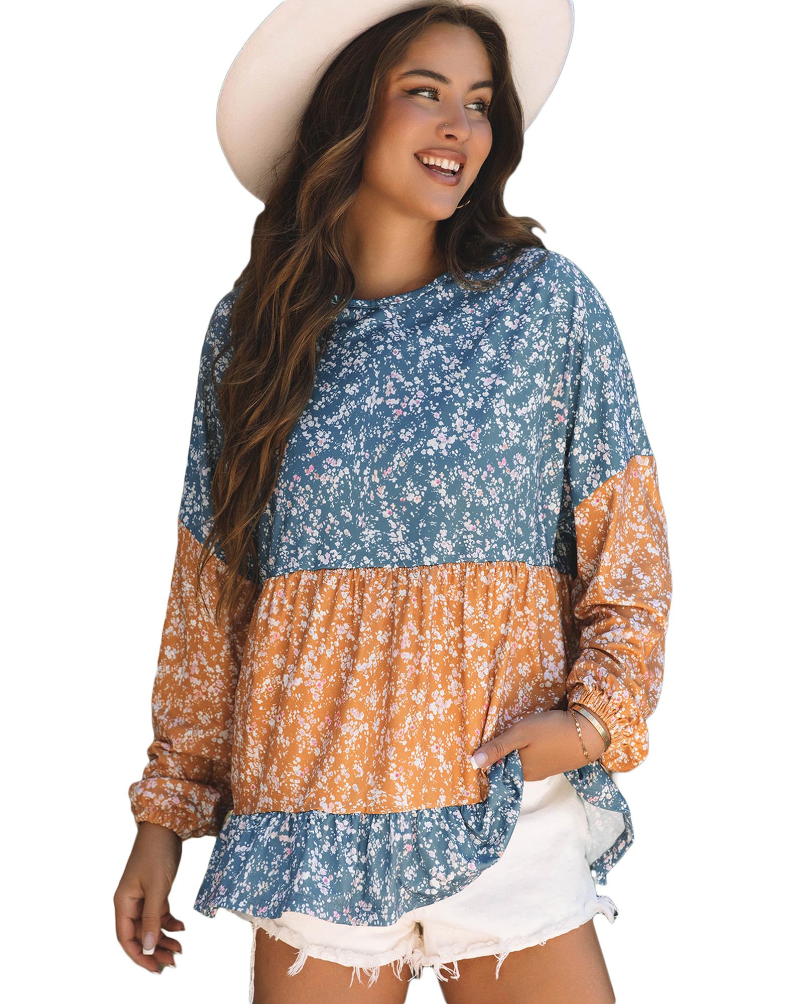 Orange Floral Color Block Patchwork Ruffled Hem Round Neck Blouse – M
