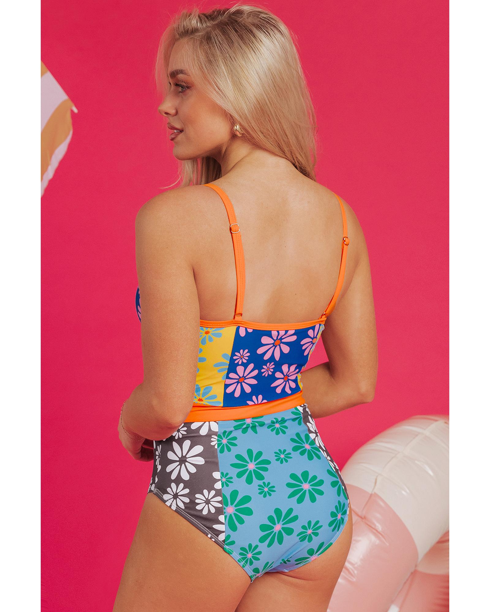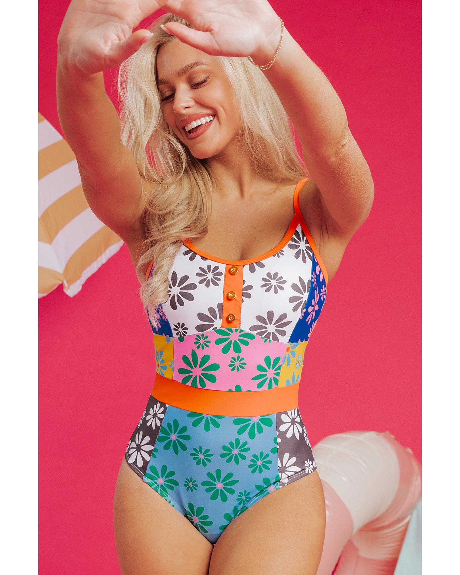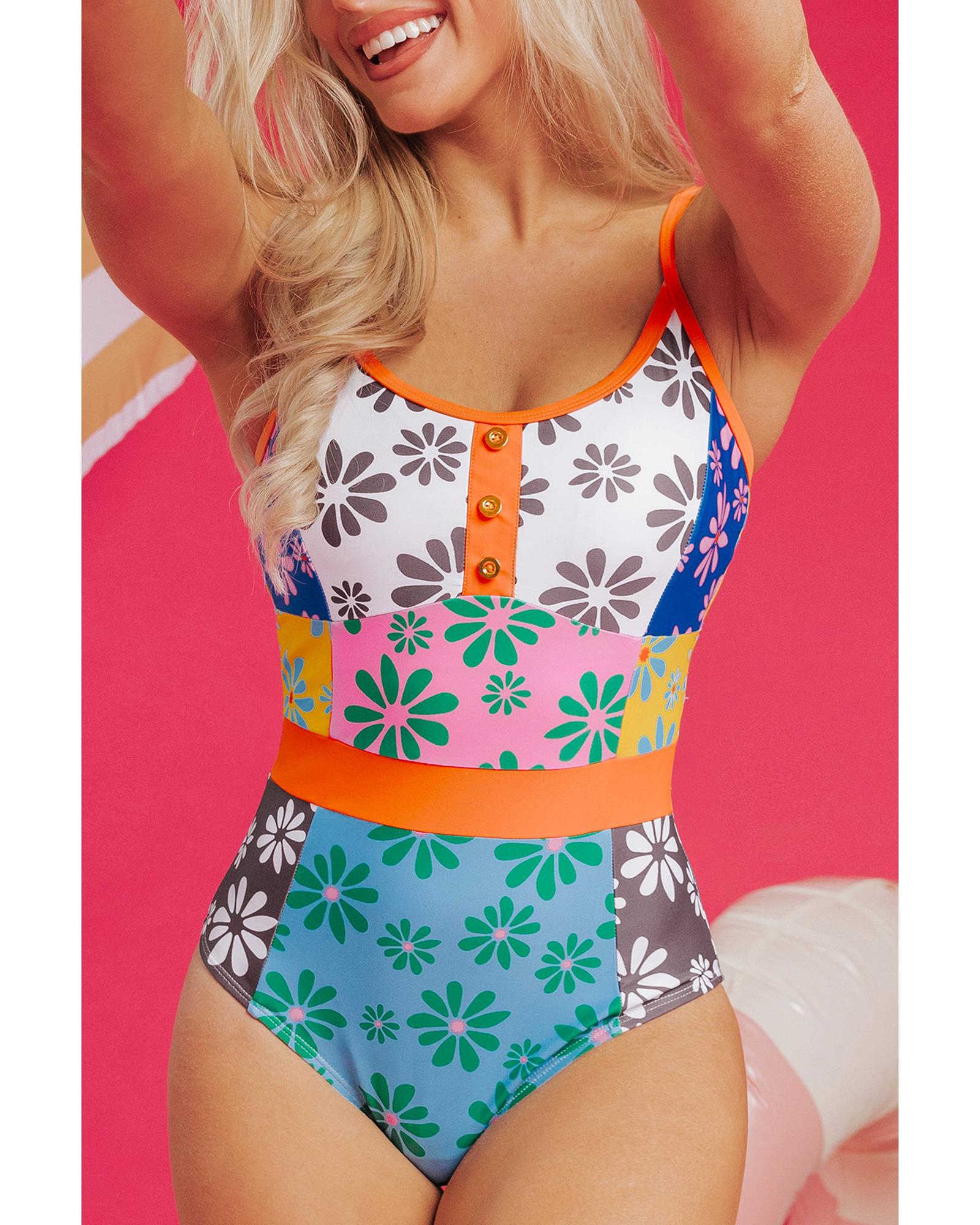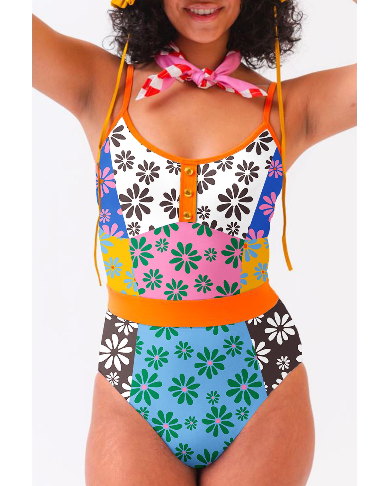 Orange Floral Colorblock Buttoned Decor Front Spaghetti Straps Teddy Swimsuit – S