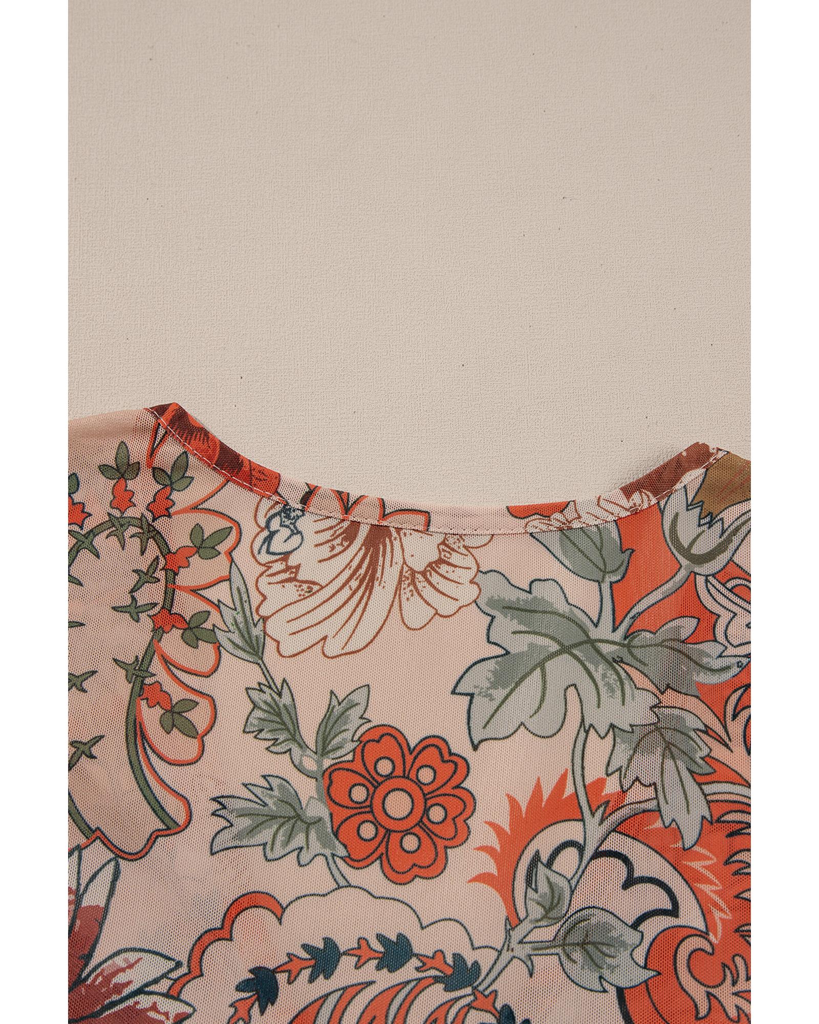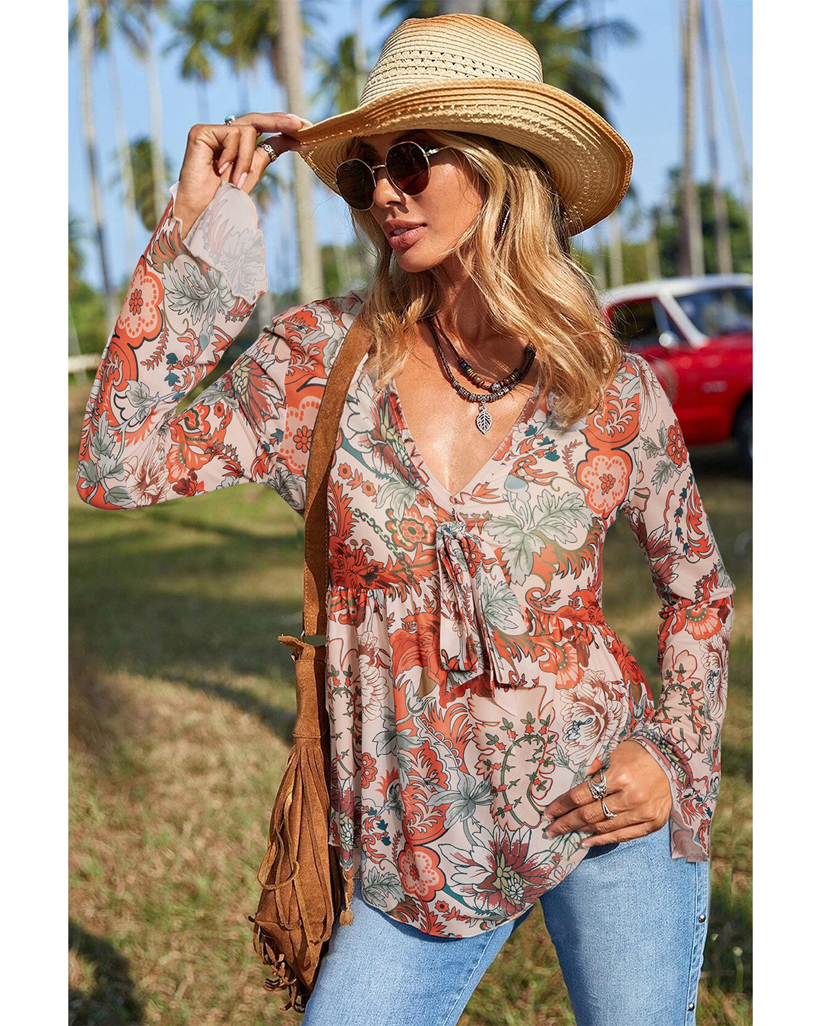 Orange Floral Print Deep V Neck Knot Bell Sleeve Blouse – L