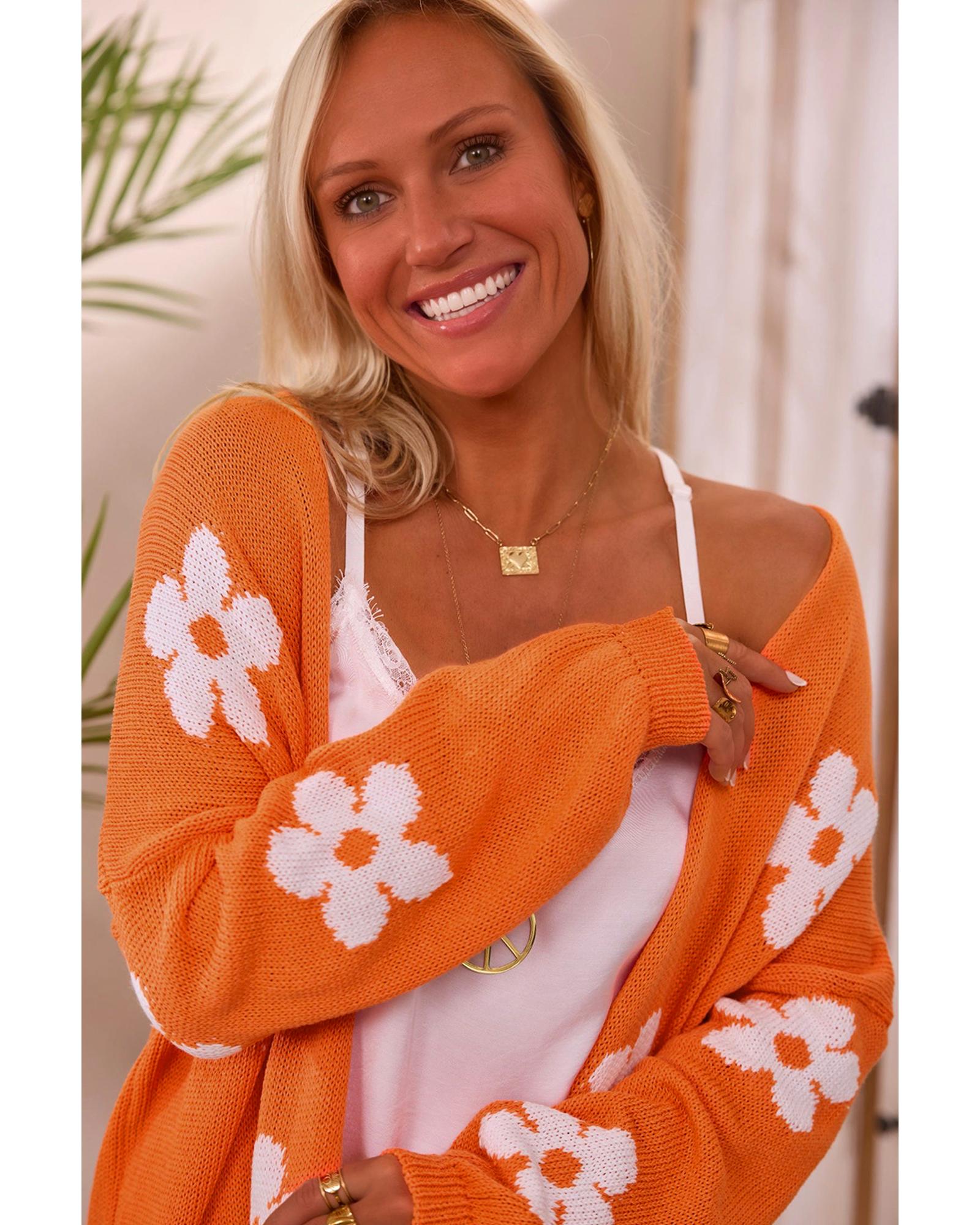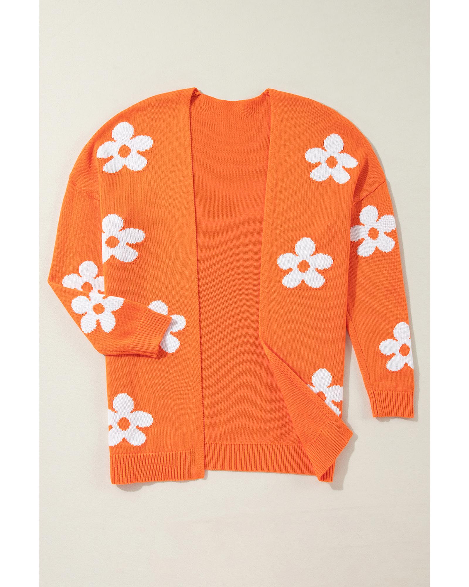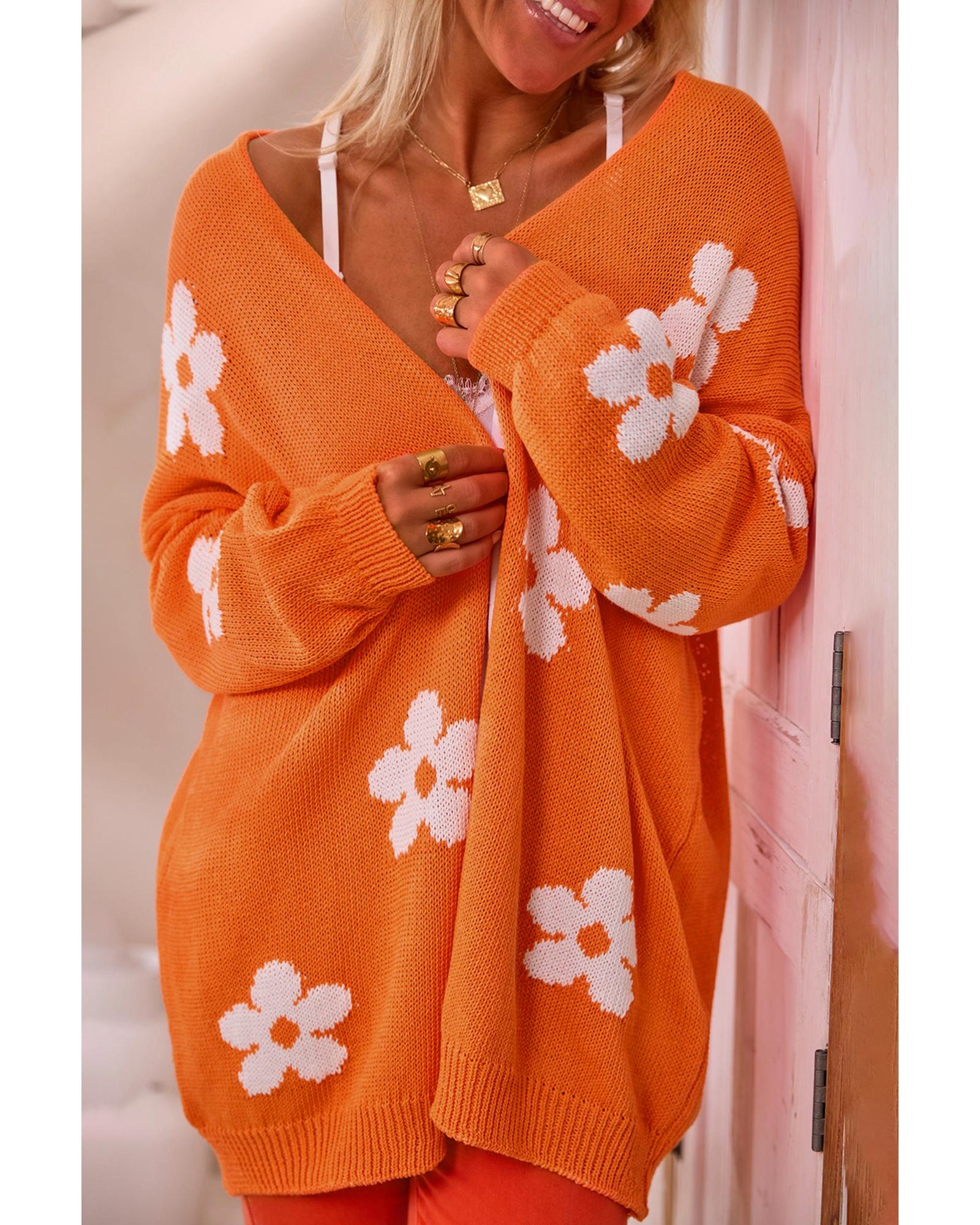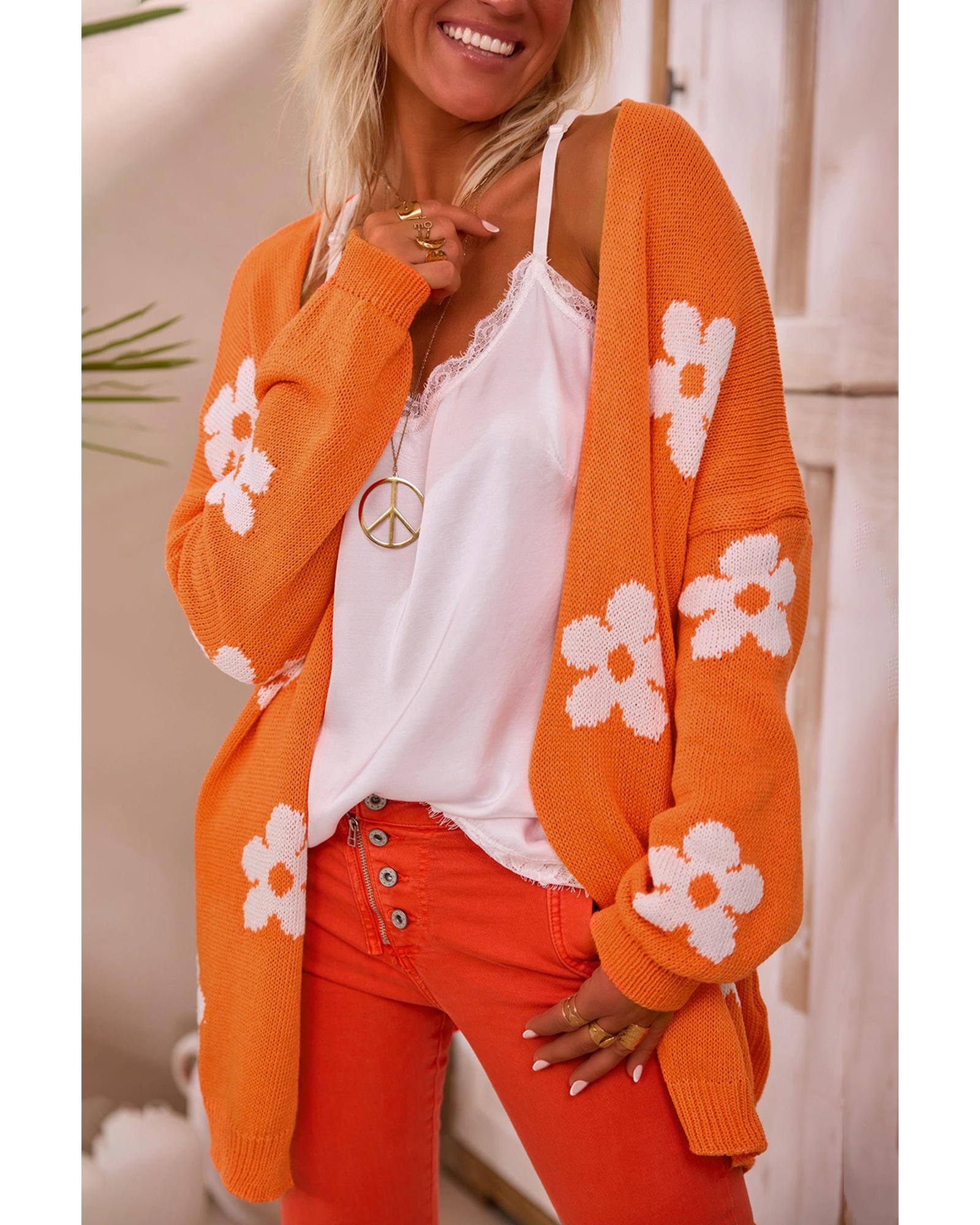 Orange Floral Print Knitted Open Front Loose Cardigan – S