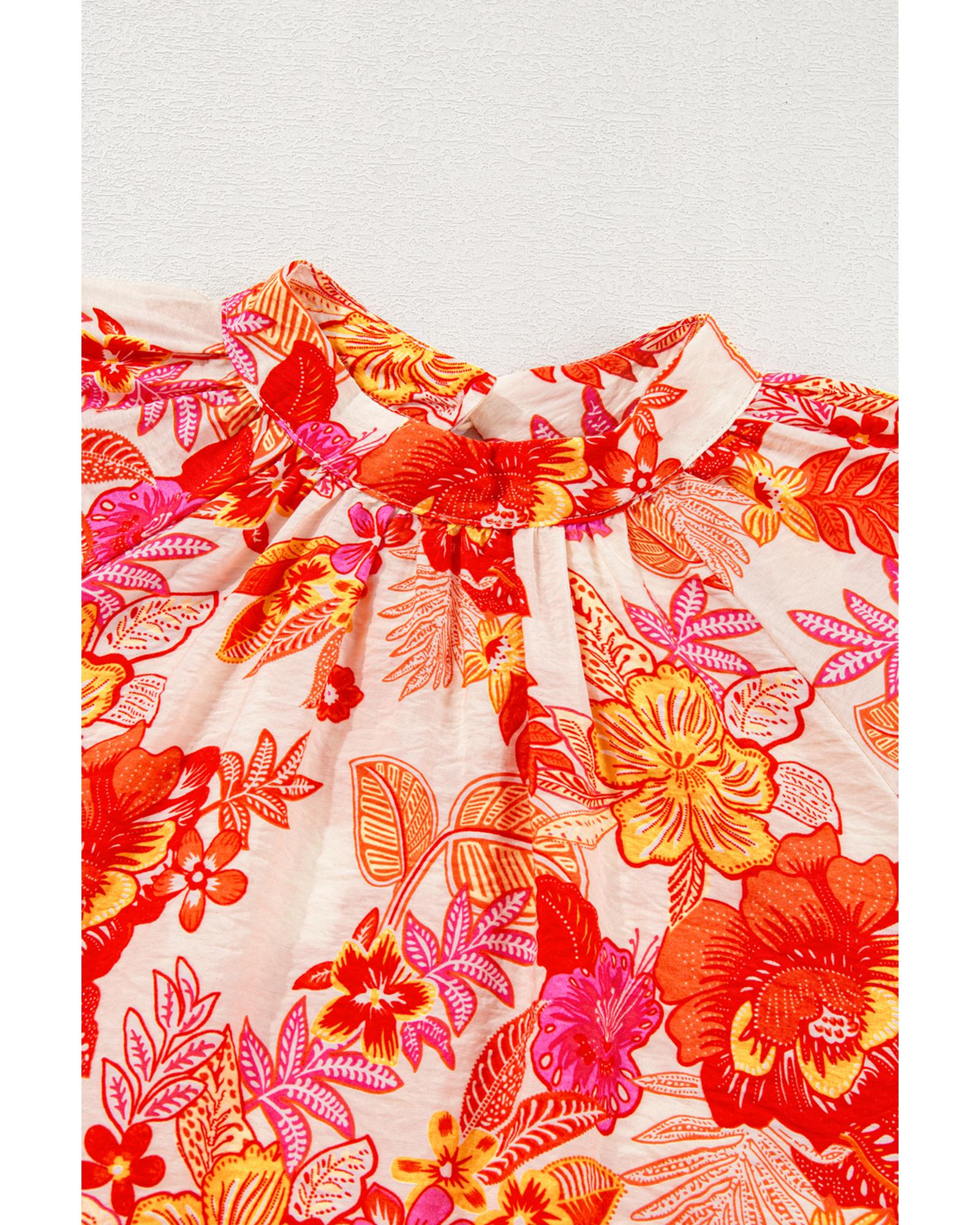Orange Floral Print Pearl Button Keyhole Long Puff Sleeve Blouse – L