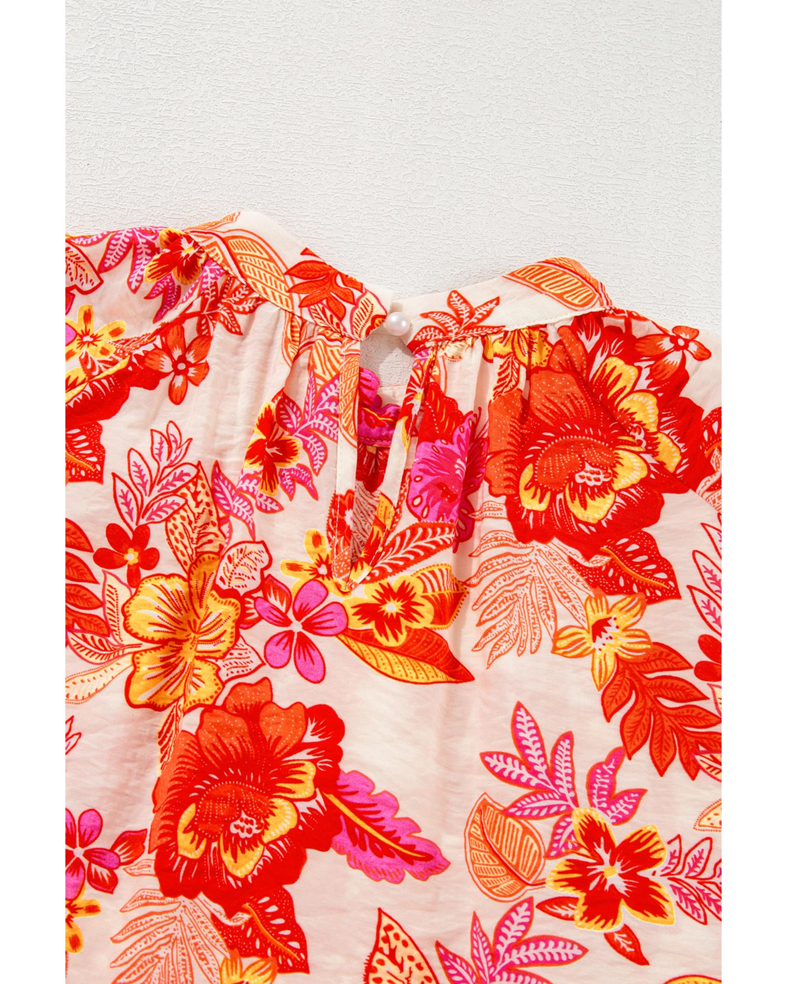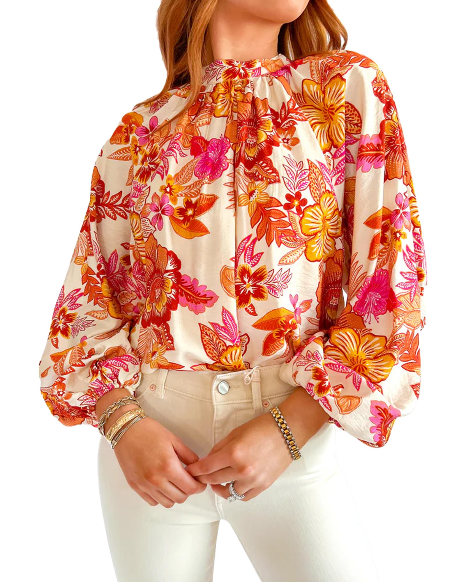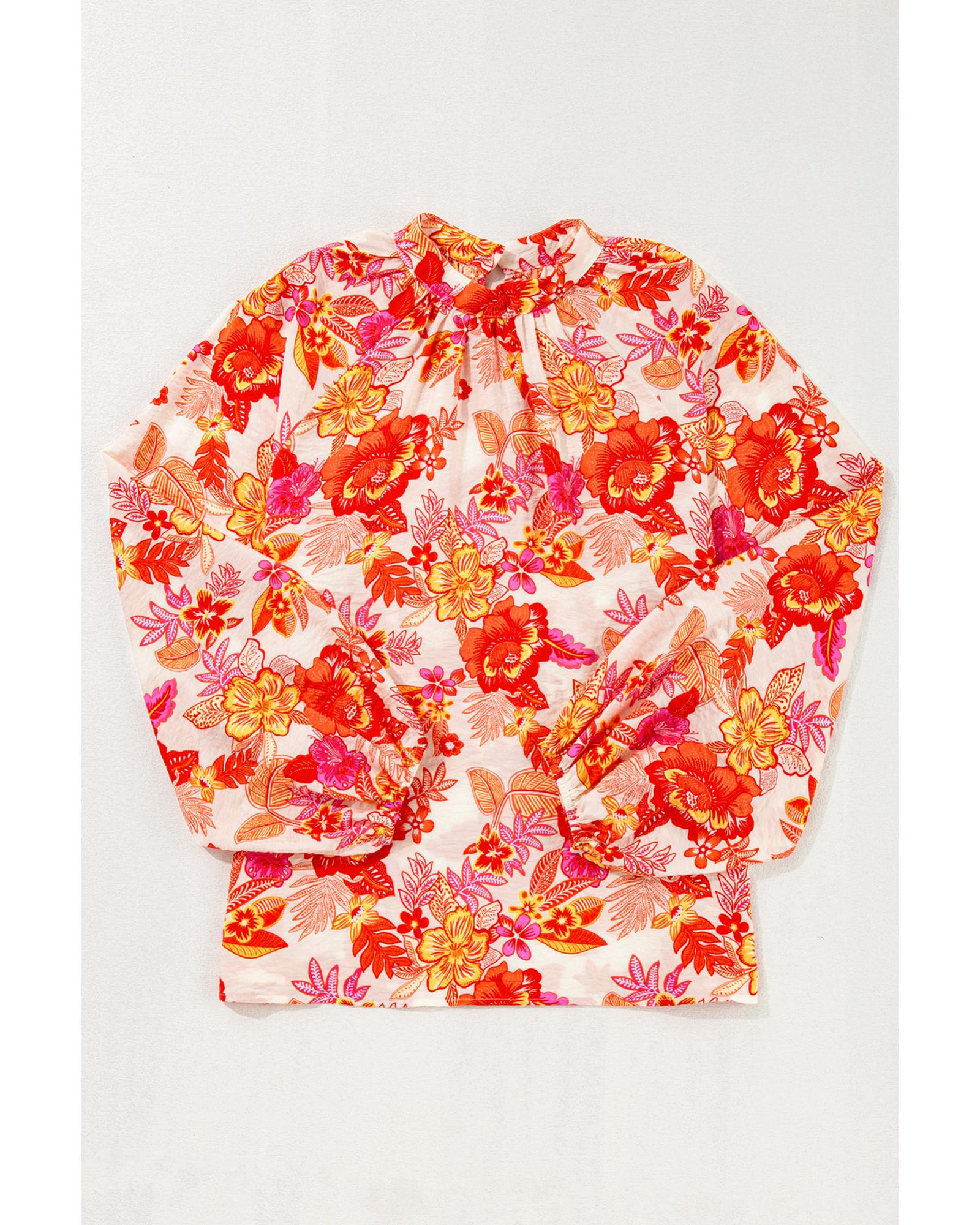 Orange Floral Print Pearl Button Keyhole Long Puff Sleeve Blouse – S