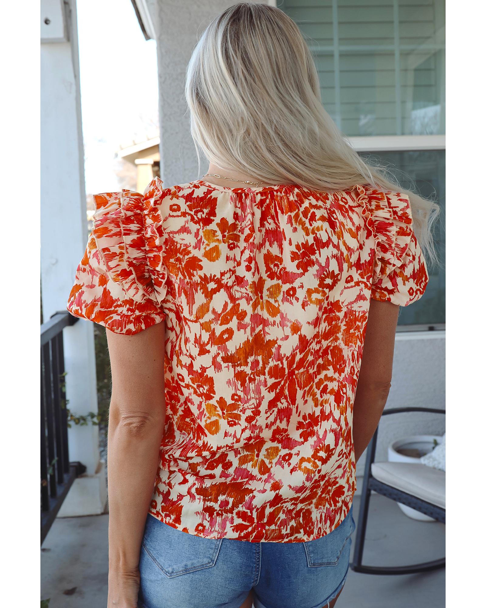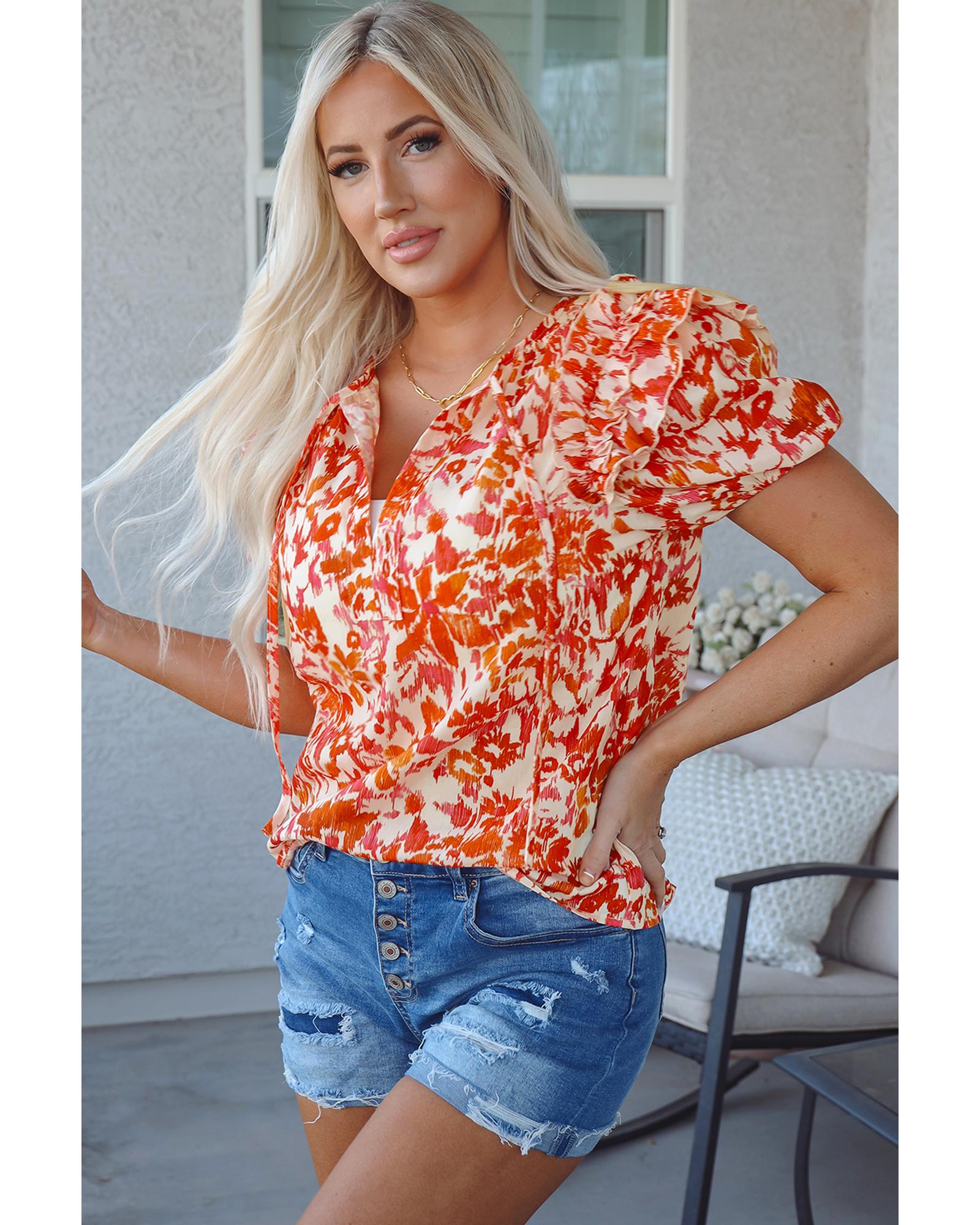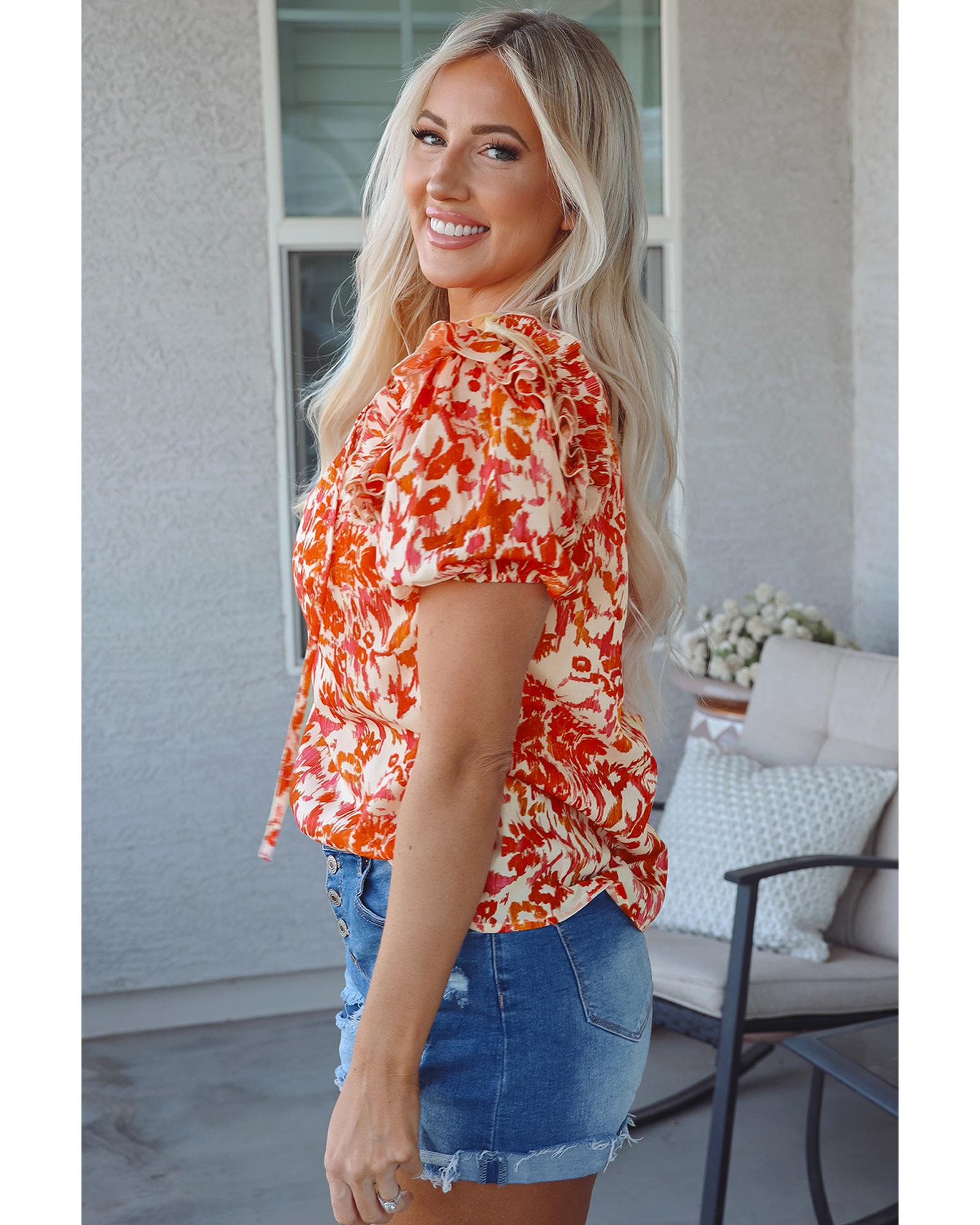 Orange Floral Print Ruffled Short Puff Sleeve Split Neck Blouse – M