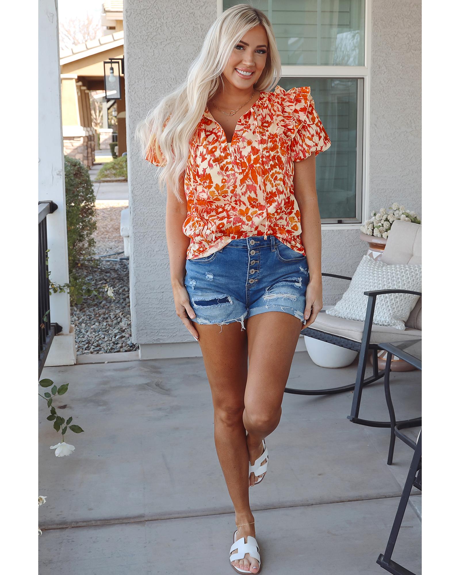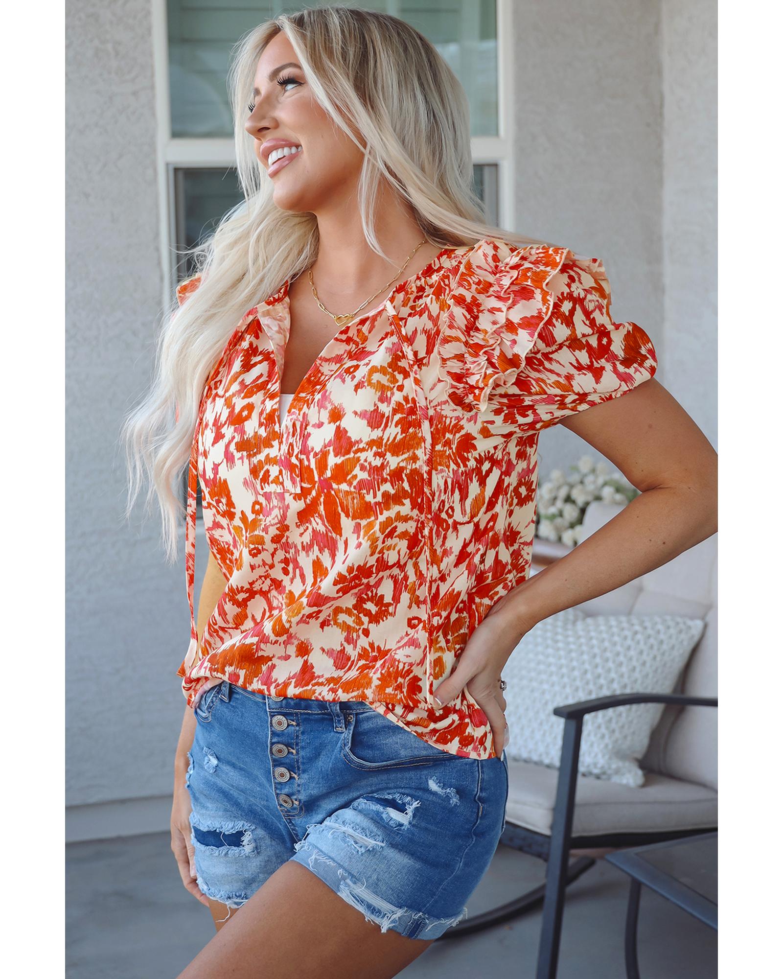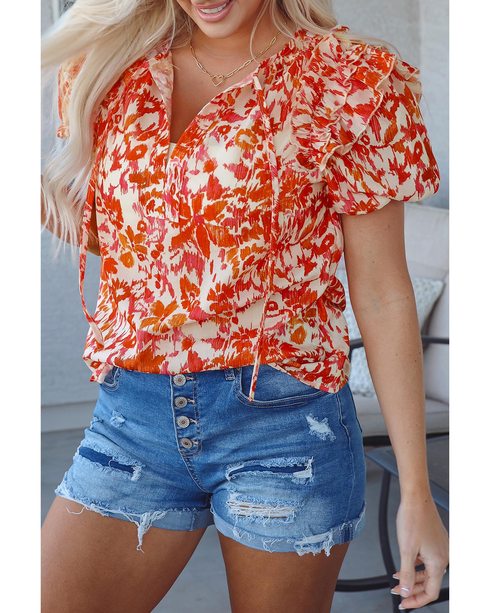 Orange Floral Print Ruffled Short Puff Sleeve Split Neck Blouse – M