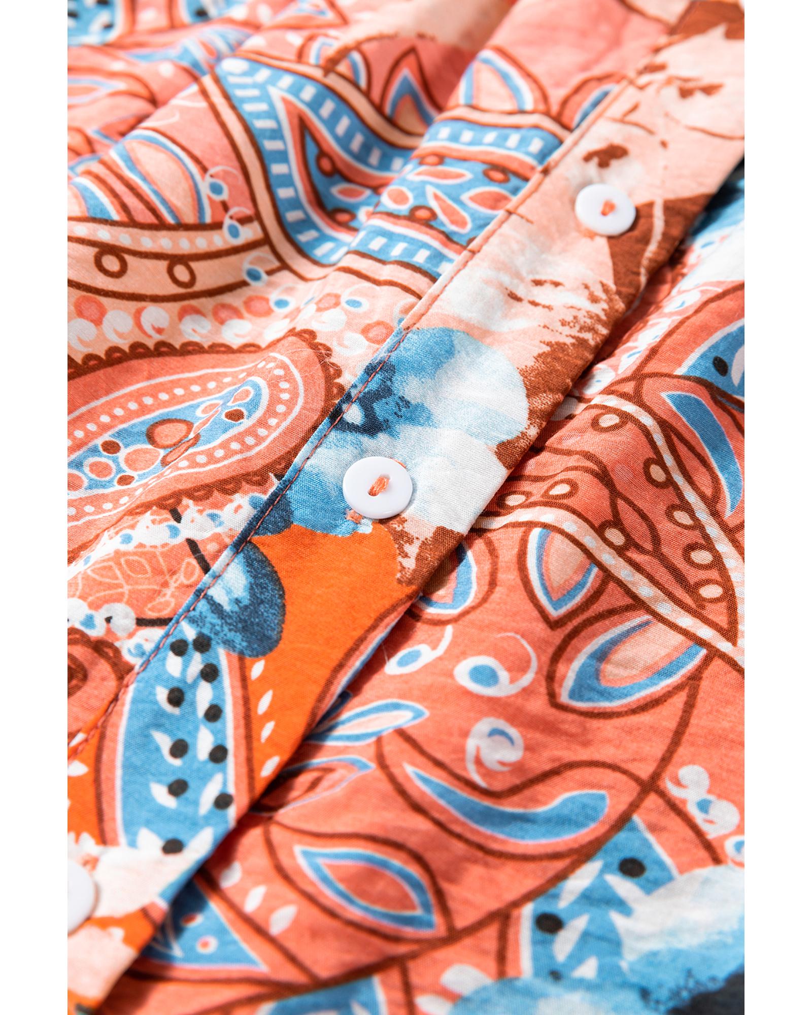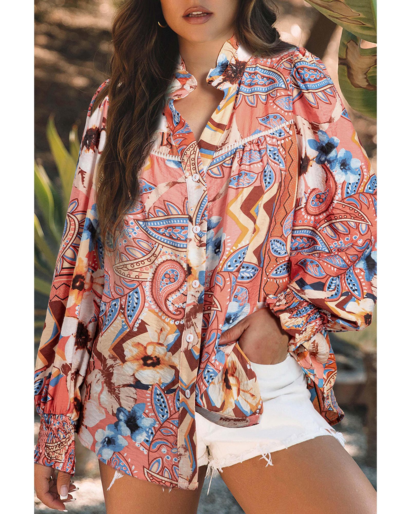 Orange Floral Print Shirred Cuff Buttoned Loose Shirt – M