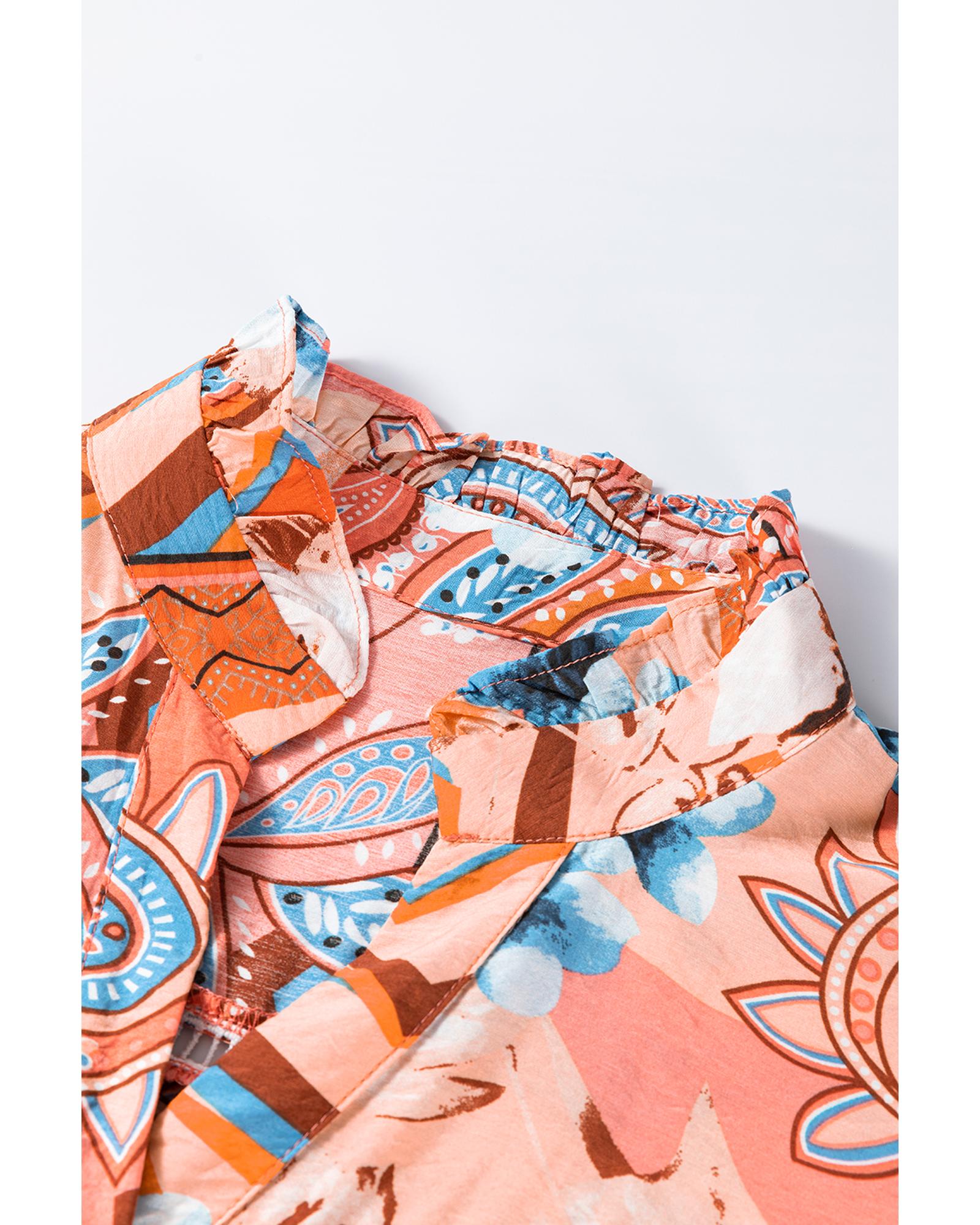 Orange Floral Print Shirred Cuff Buttoned Loose Shirt – XL
