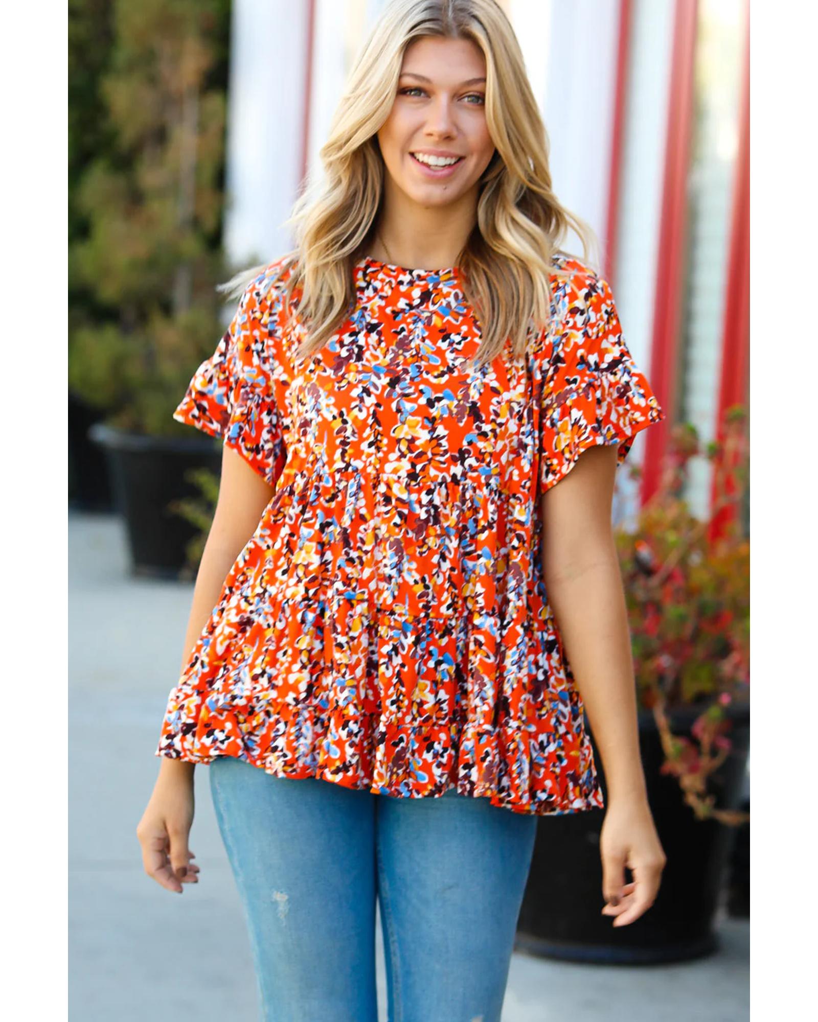 - Orange Floral Printed Ruffle Sleeve Curvy Babydoll Blouse