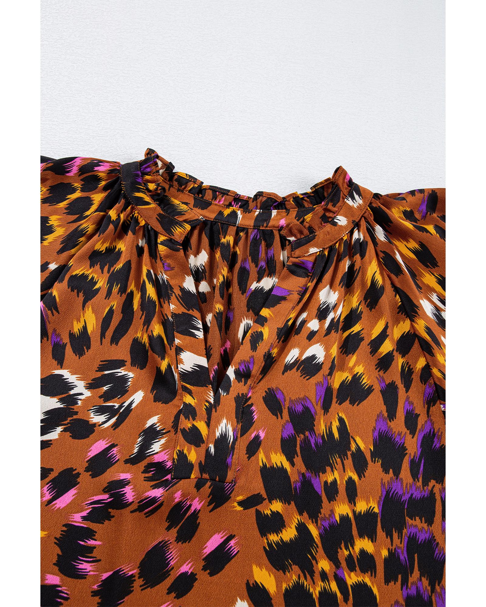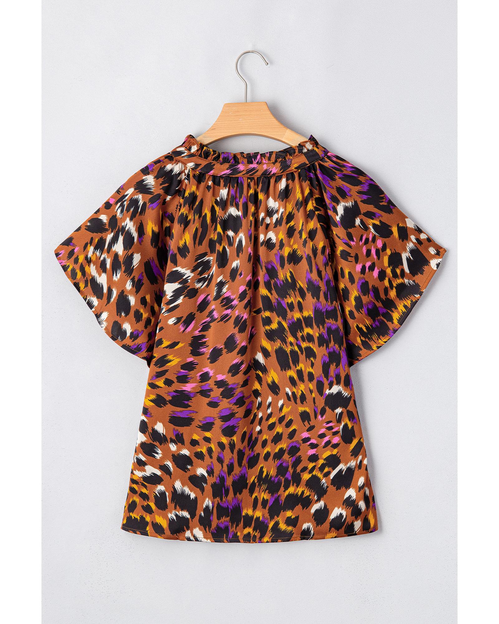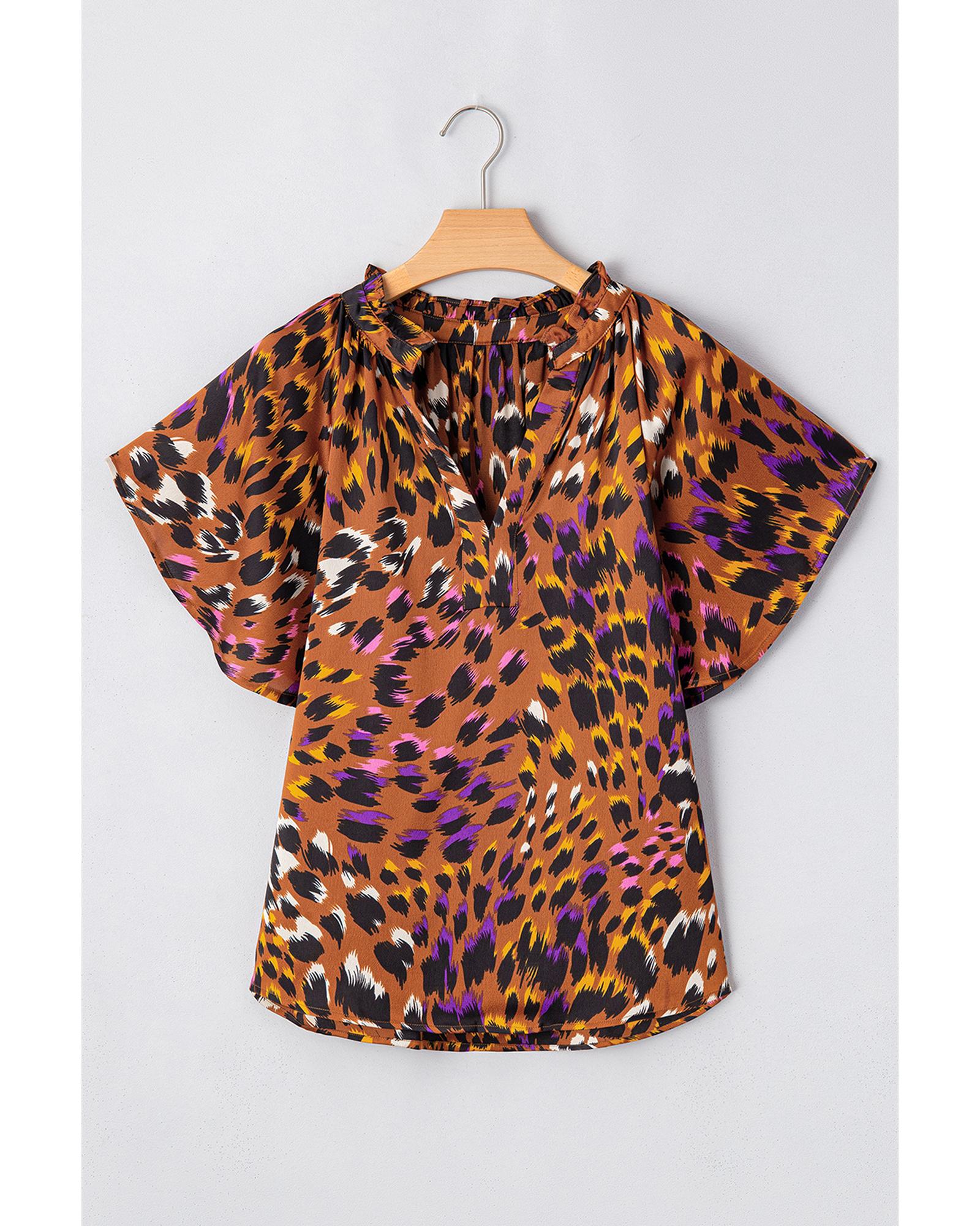 Orange Leopard Printed Draped Short Sleeve Slit V Neck Blouse – XL