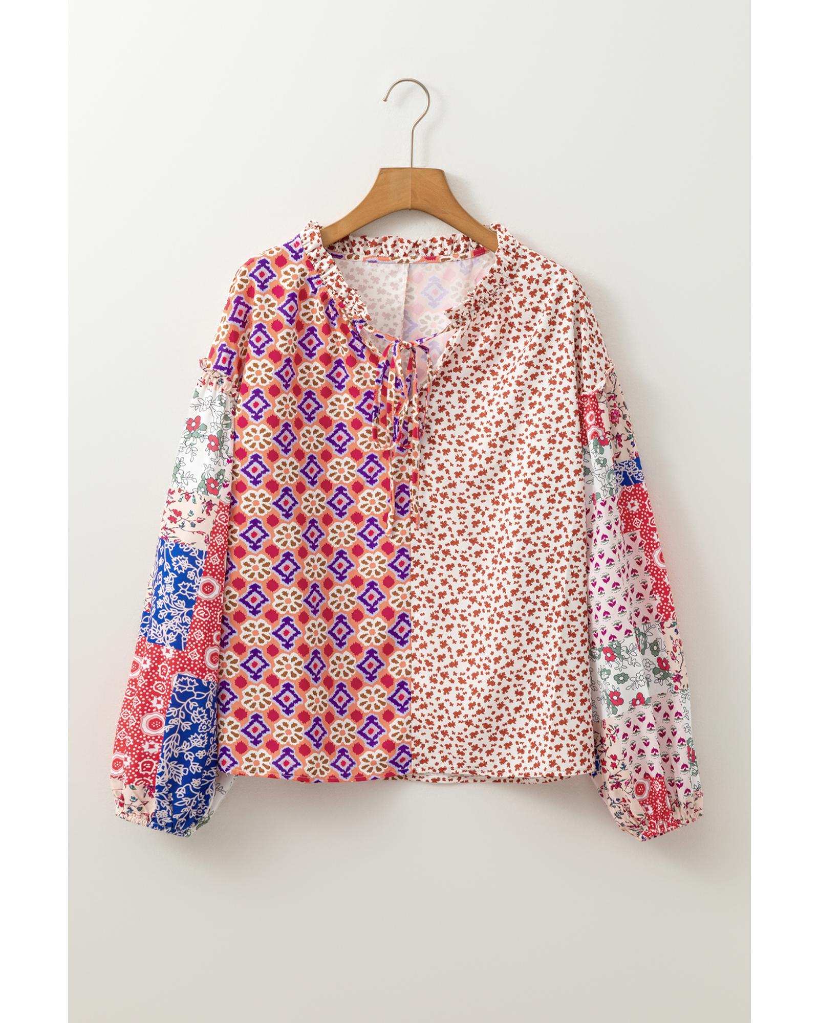 Orange Mixed Floral Printed Long Sleeve Tied V Neck Blouse – L