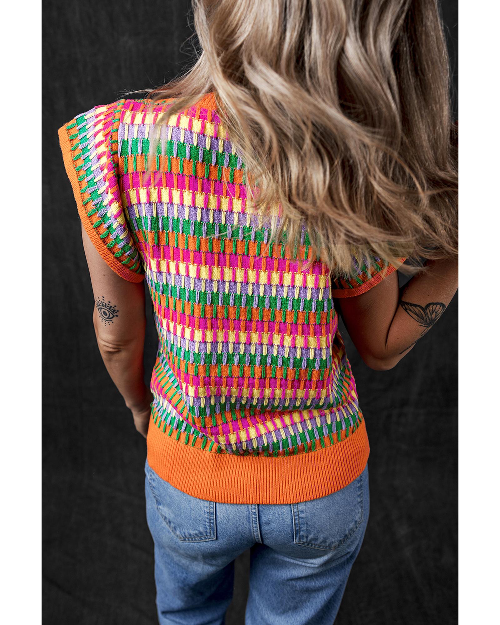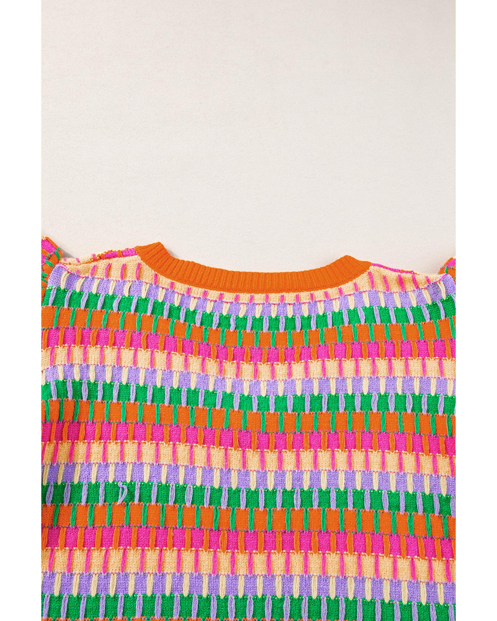 Orange Multicolor Flutter Sleeve Knitted Sweater Top - L