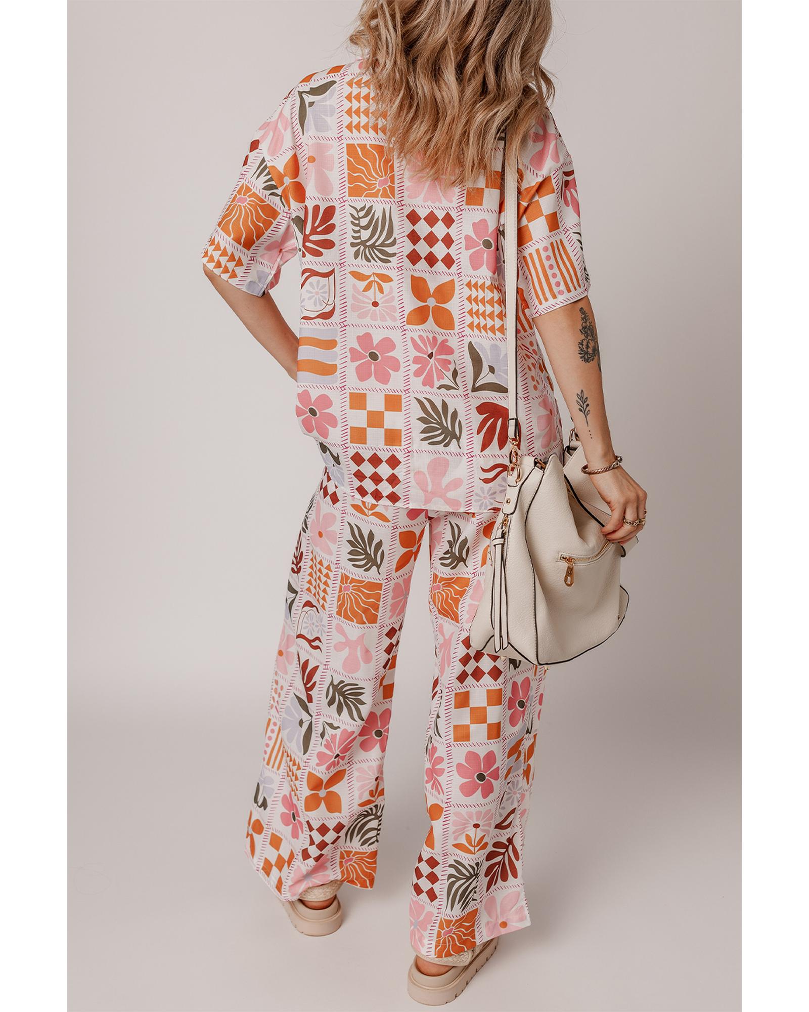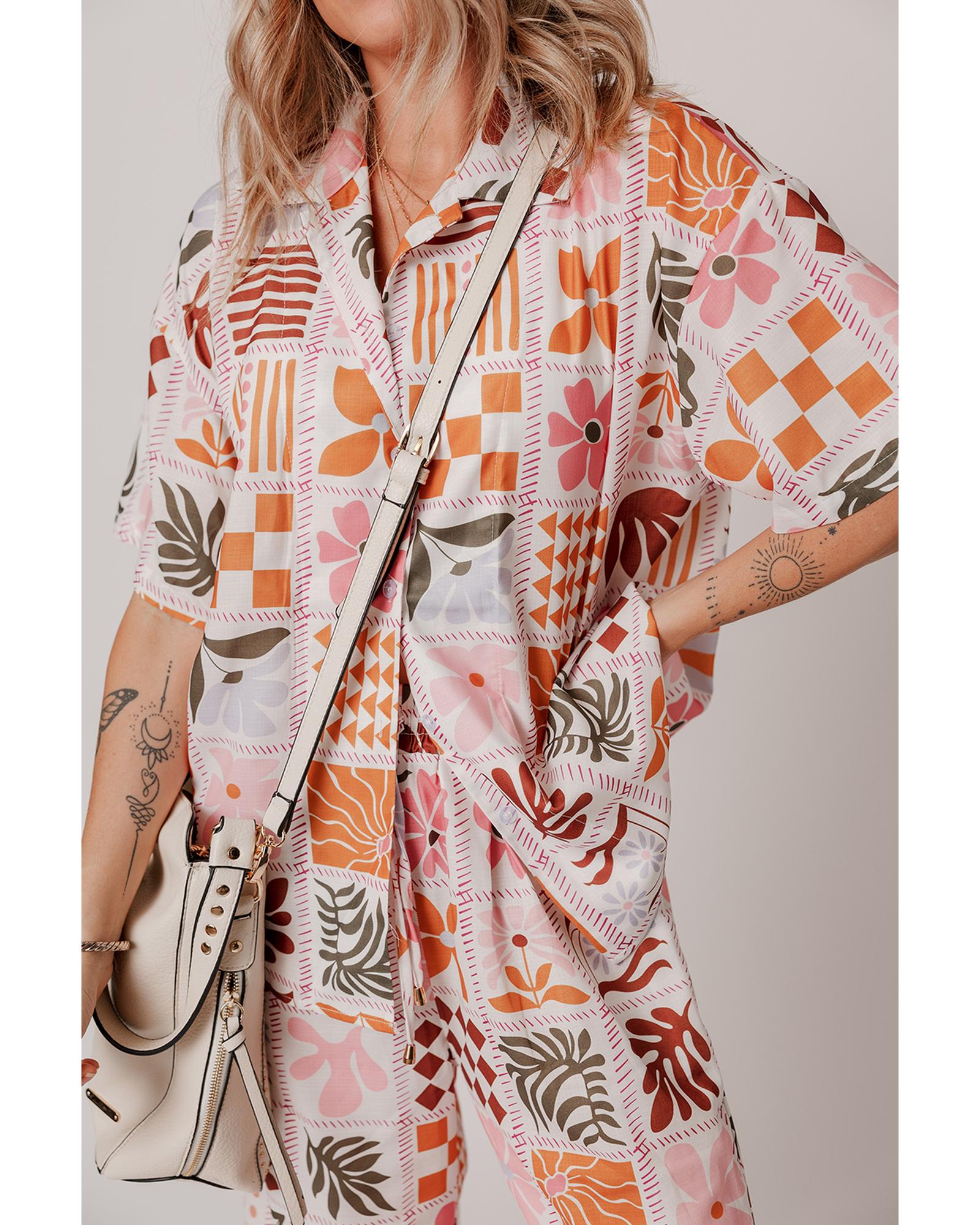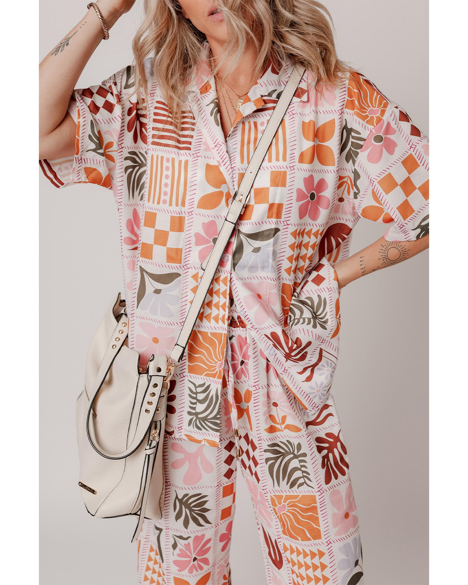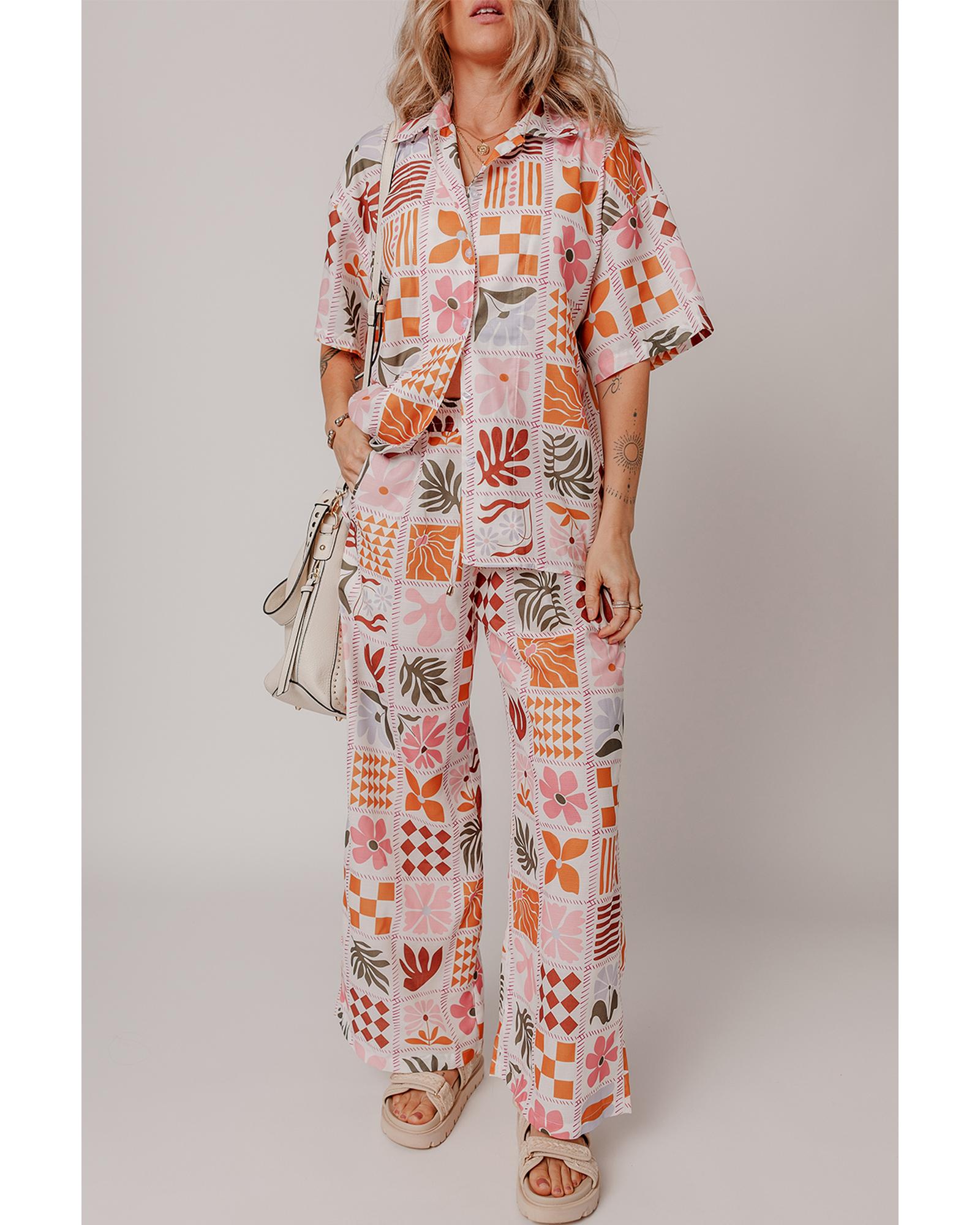 Orange Plant Checkered Print Collared Shirt and Wide Leg Pants Set – M
