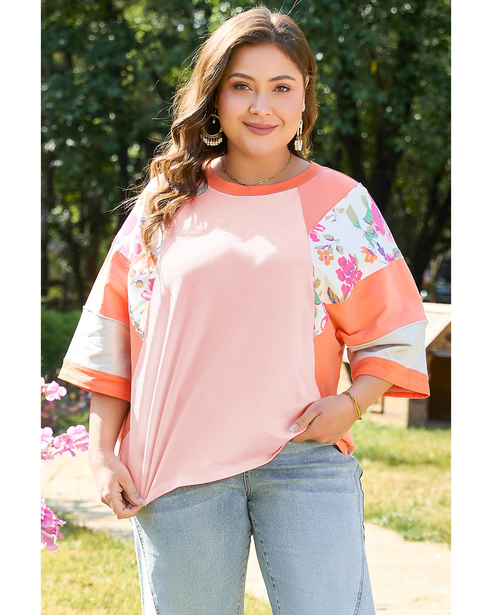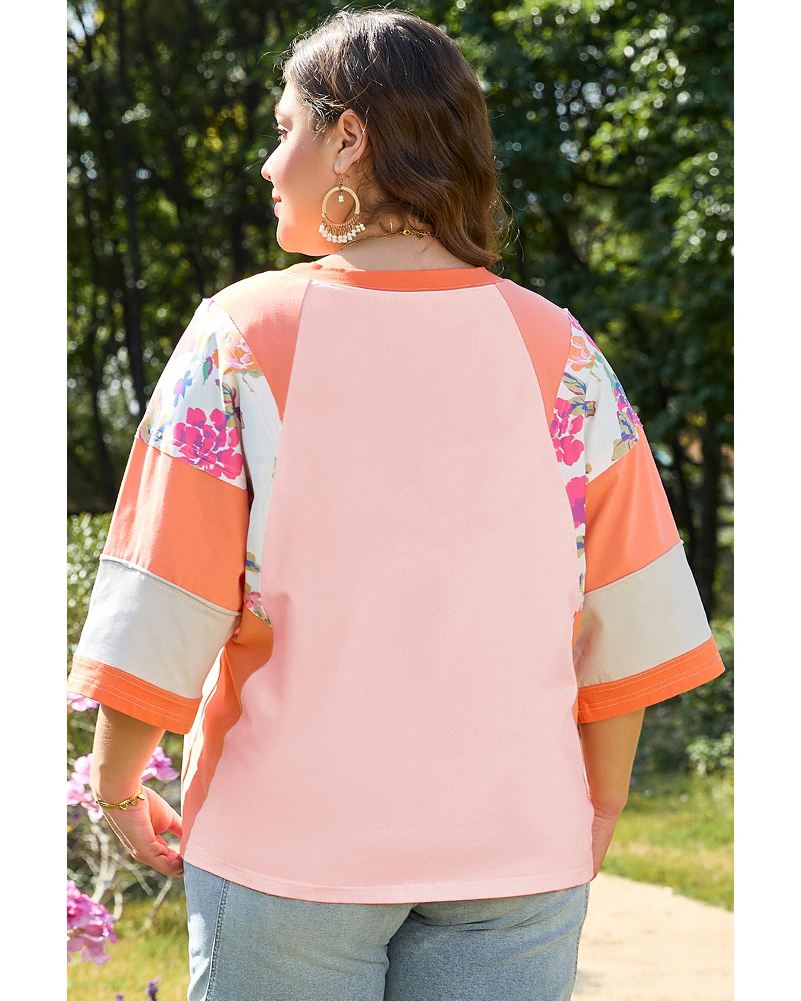 Orange Plus Size Floral Print Patchwork Raglan Half Sleeve Top – 3X