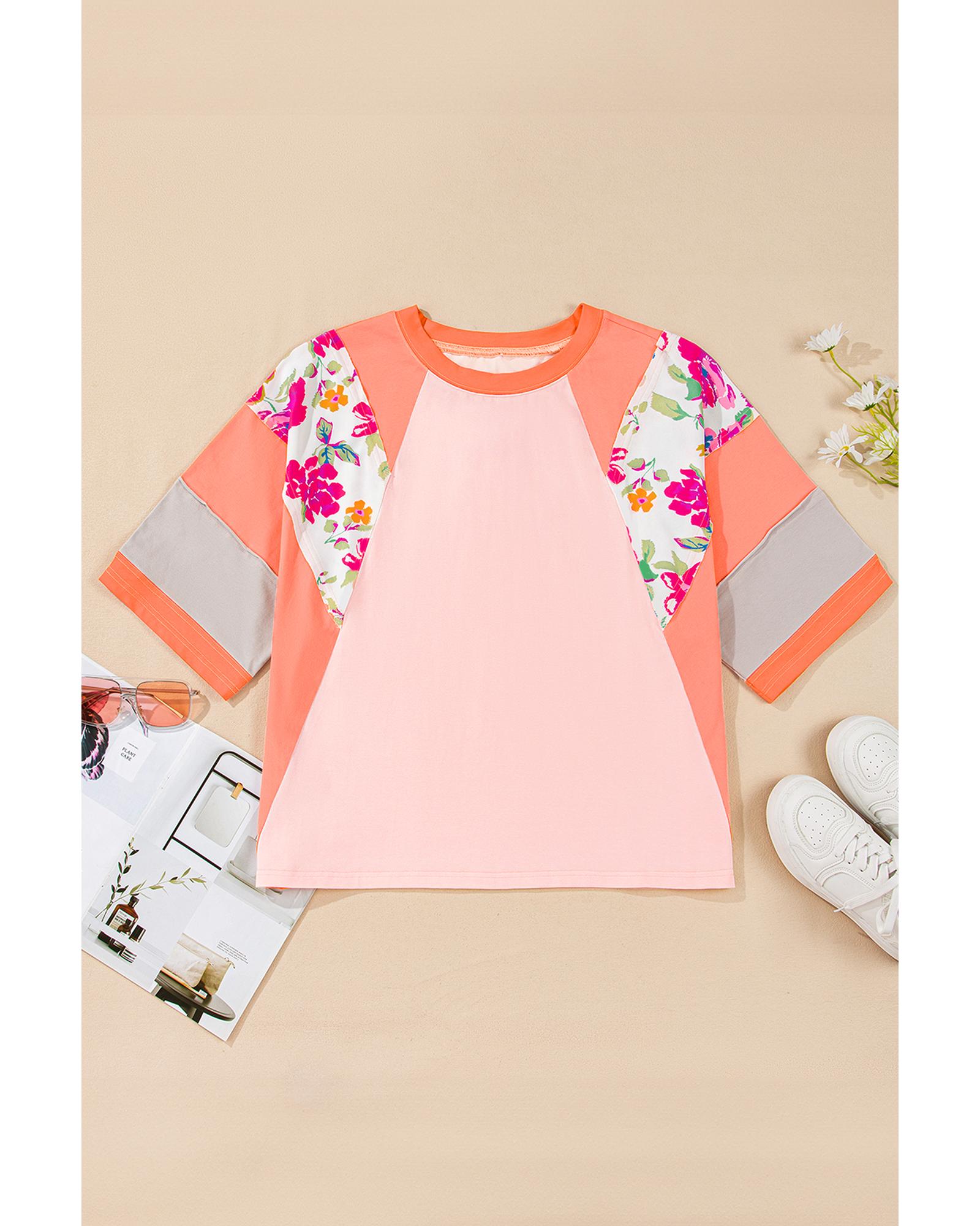 Orange Plus Size Floral Print Patchwork Raglan Half Sleeve Top – 4X