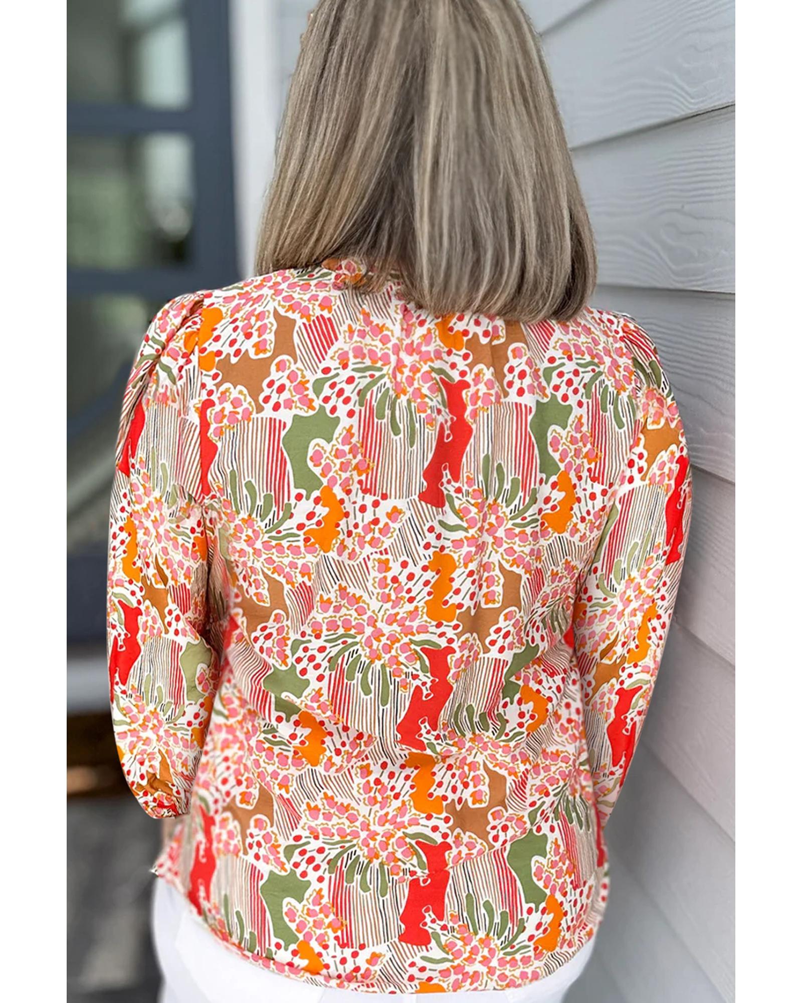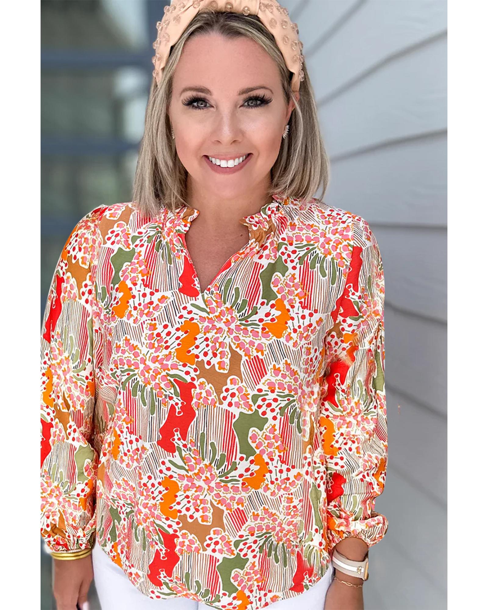 Orange Printed Floral Abstract Print Frilled V Neck Plus Size Blouse – 1X