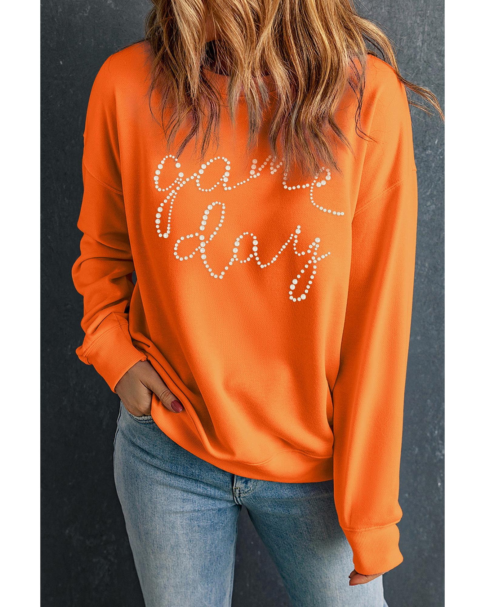 • Orange Rhinestone Game Day Pattern Drop Shoulder Sweatshirt