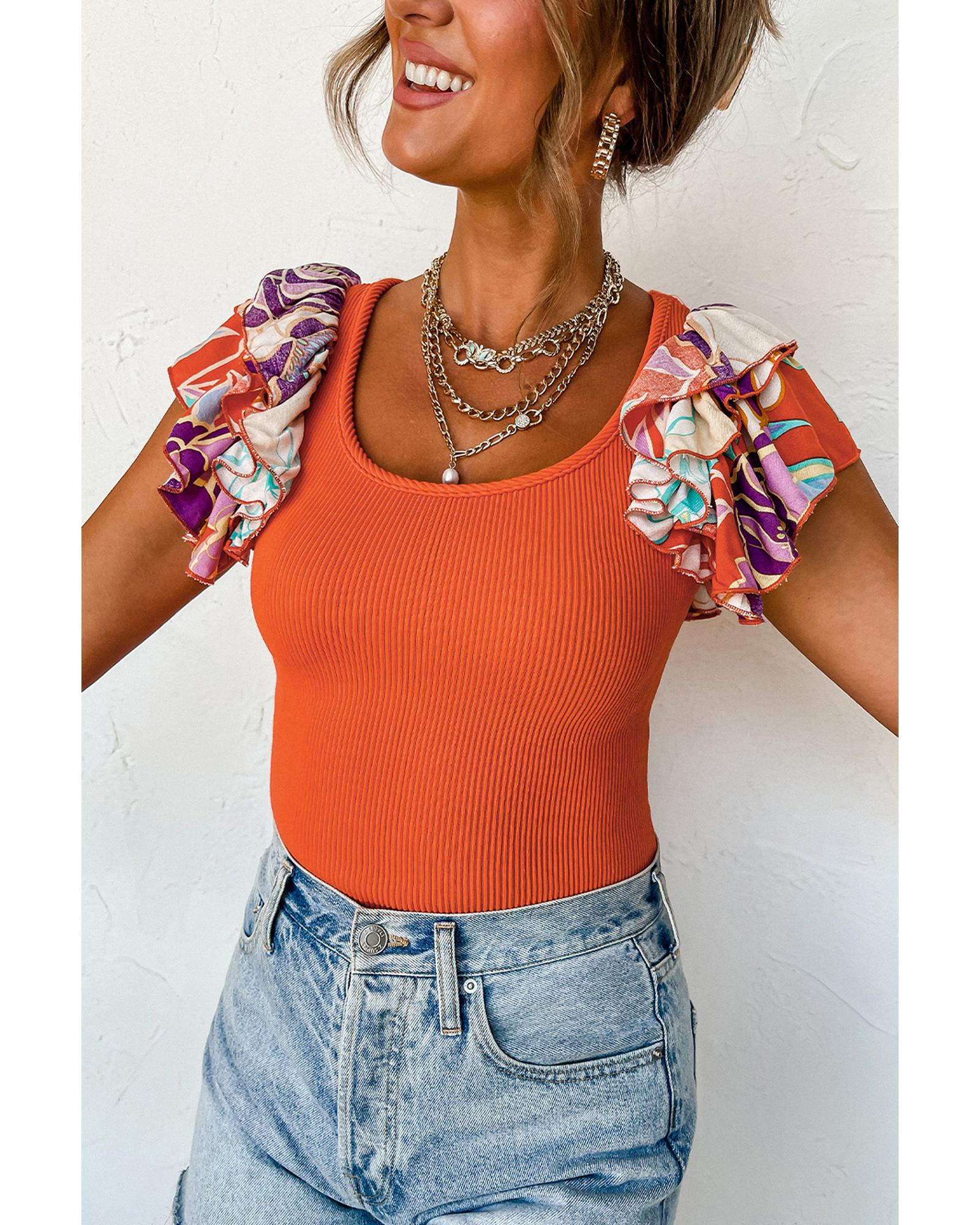 Orange Ribbed Knit Tiered Ruffled Sleeve Bodysuit – XL