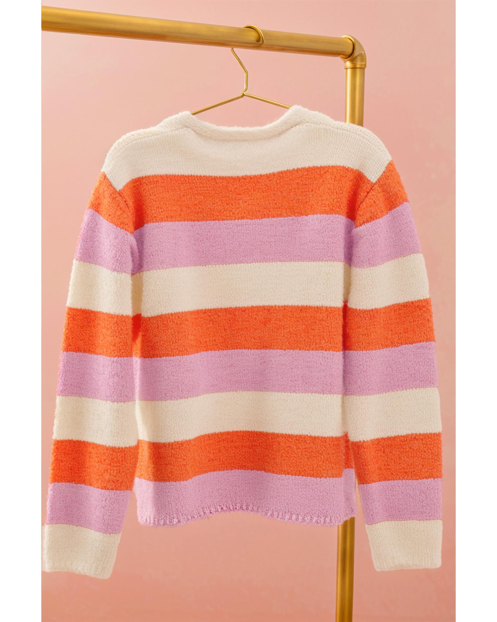 Orange Stripe Colorblock V Neck Casual Sweater – S