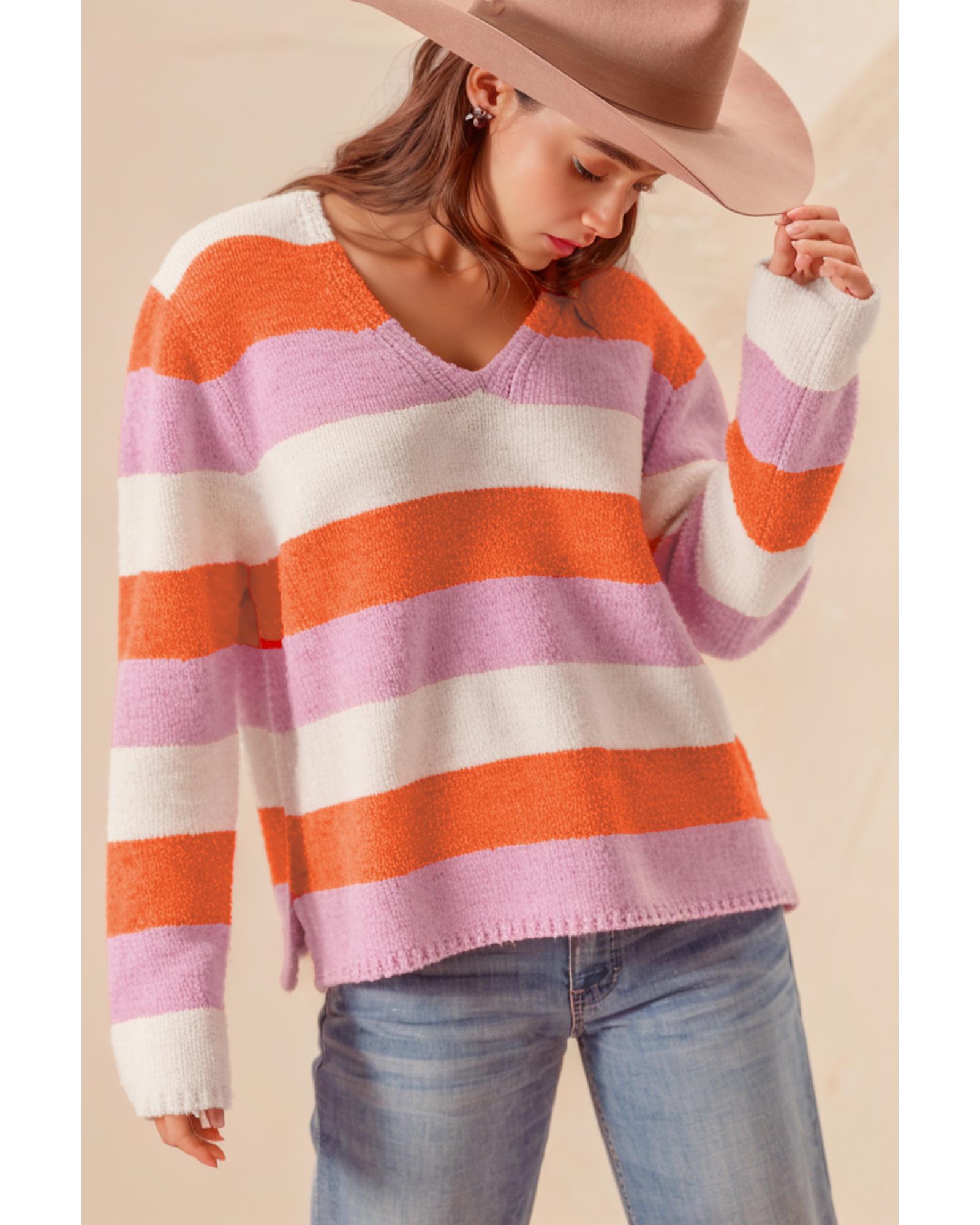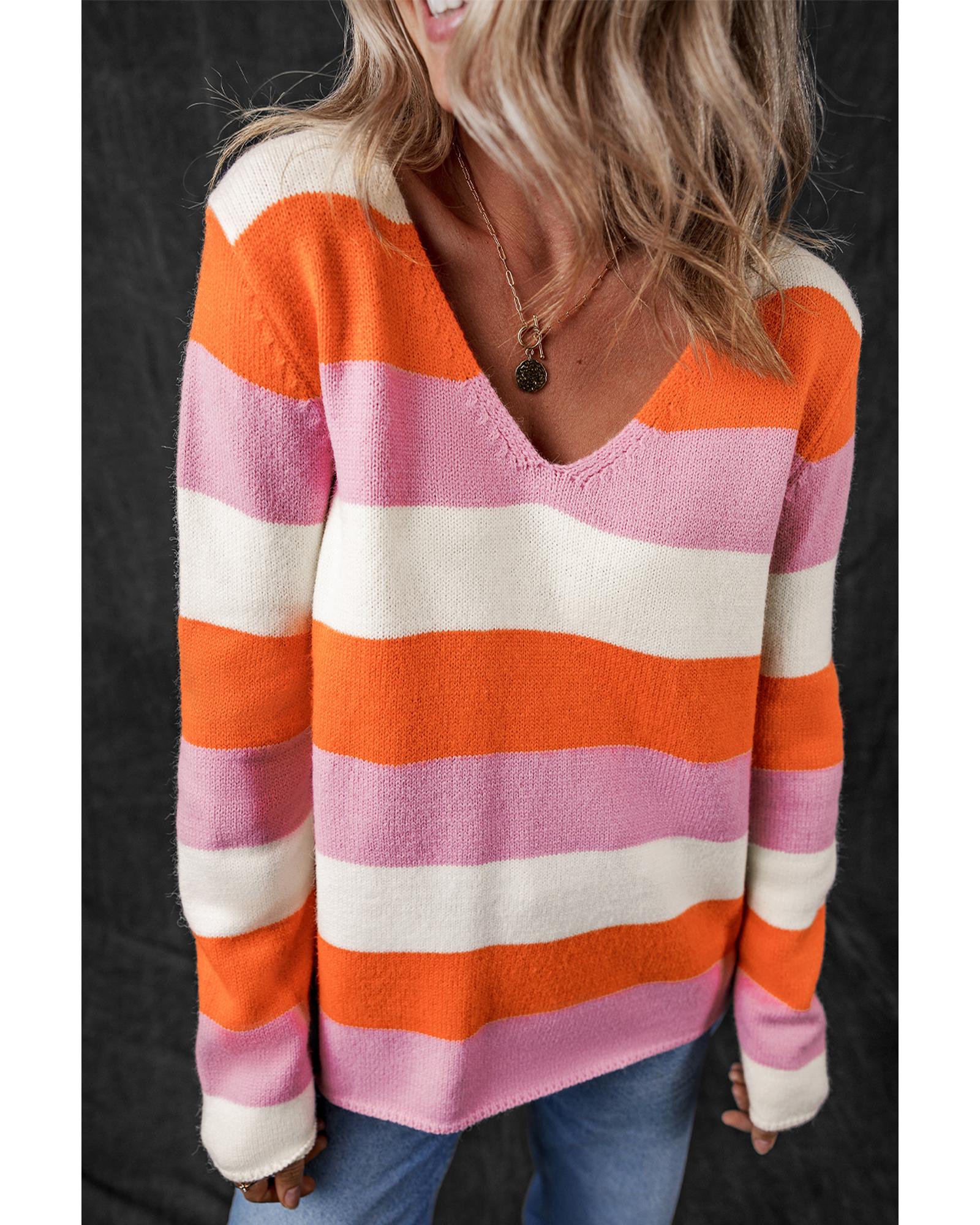 Orange Stripe Colorblock V Neck Casual Sweater – XL