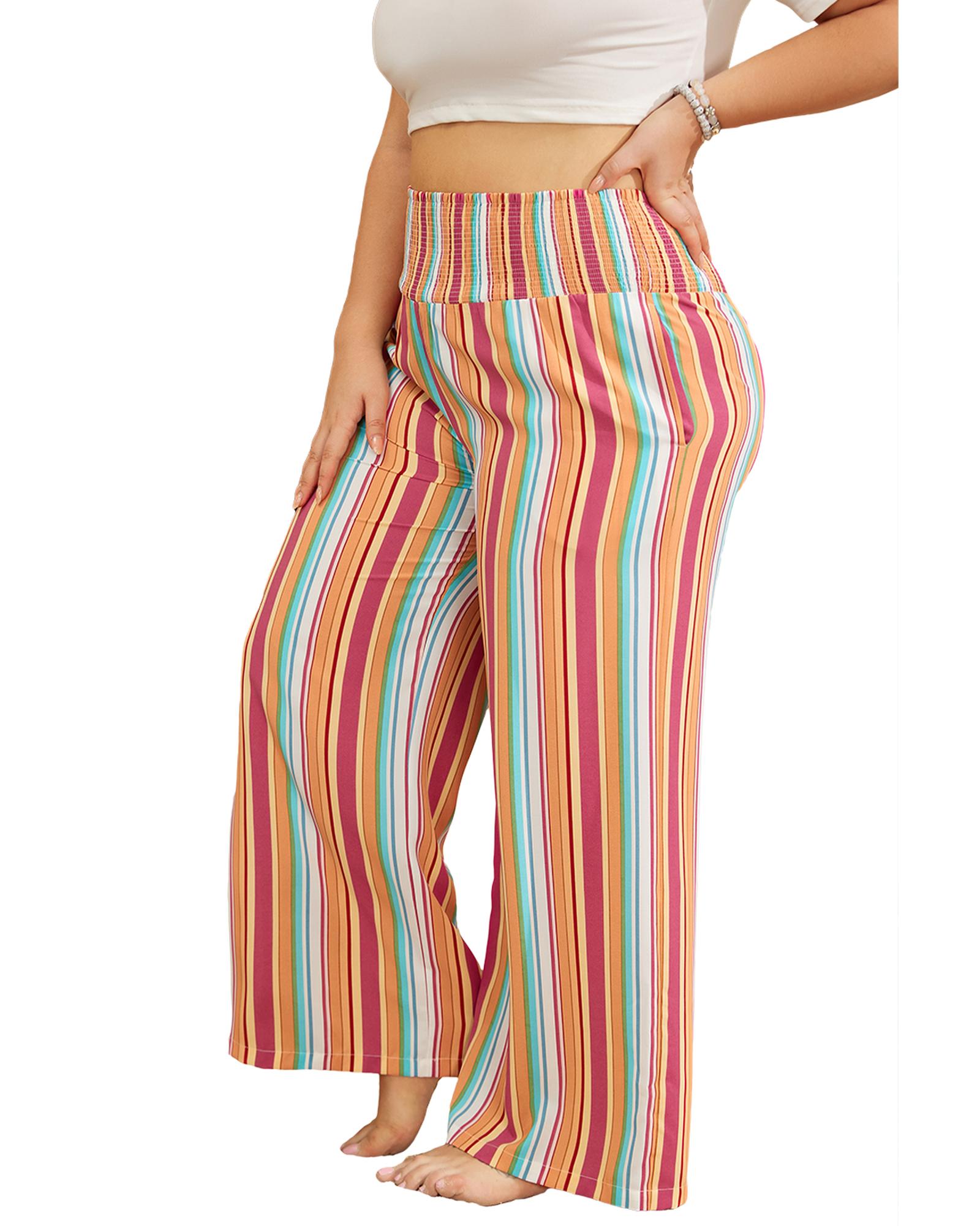 Orange Stripe Plus Size Boho Smocked Waist Loose Pants - 2X