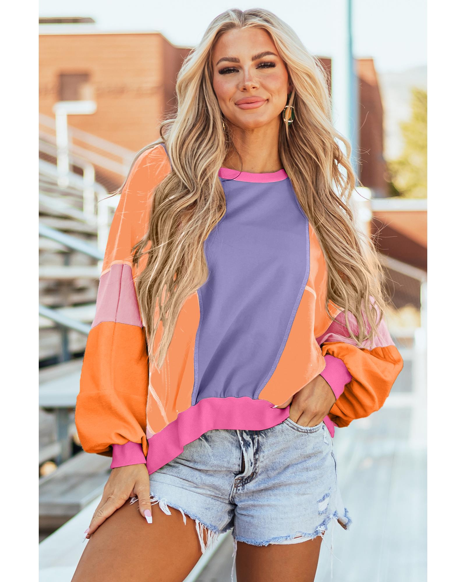 - Orchid Petal Colorblock Patchwork Exposed Stitching Oversize Top