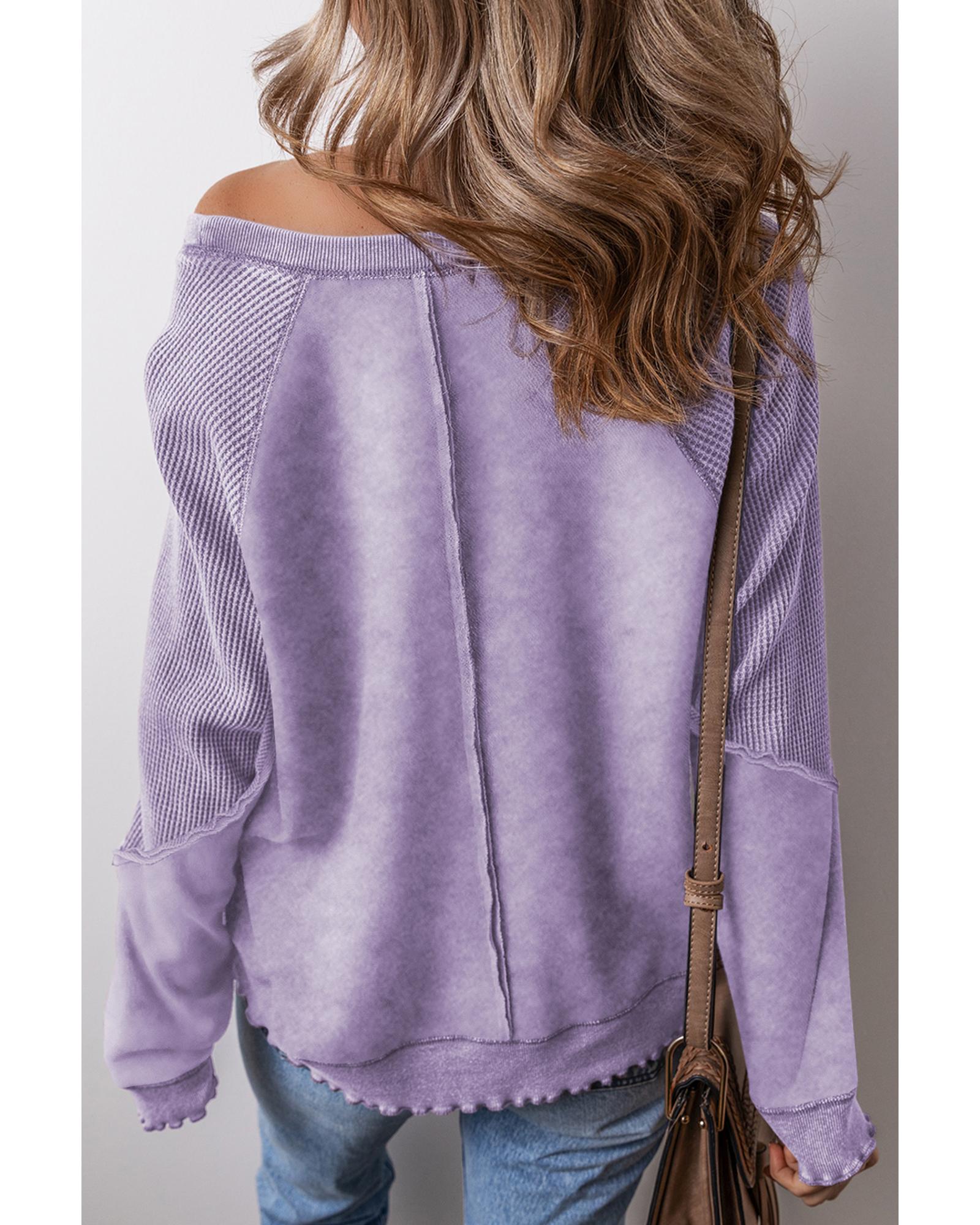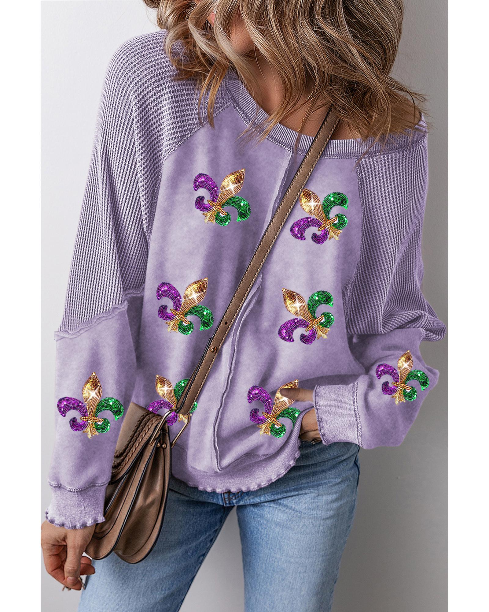 Orchid Petal Mardi Gras Patched Pattern Waffle Patchwork Sweatshirt – M
