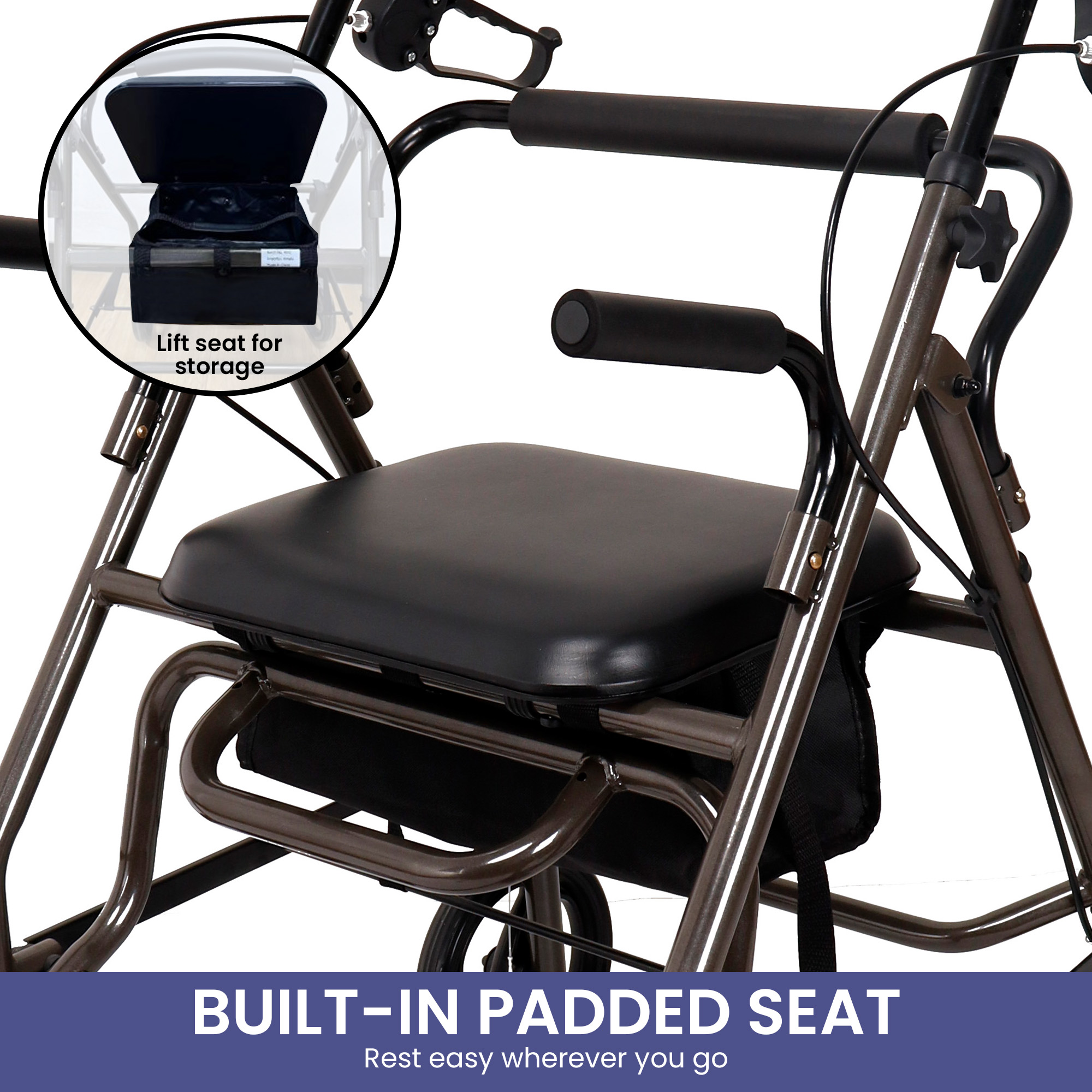 This foldable rollator walker by Orthonica is a great choice for anyone needing a little extra help getting around. Its made with a sturdy foldable steel metal frame, designed for durability and offers great convenience. Its compact design makes it easy to store and take with you wherever you go. Plus, the adjustable handles are perfect for people of all heights, making sure you stay comfortable and maintain good posture during use. And the padded seat with storage ensures you or your loved one will always have a place to rest on the go!