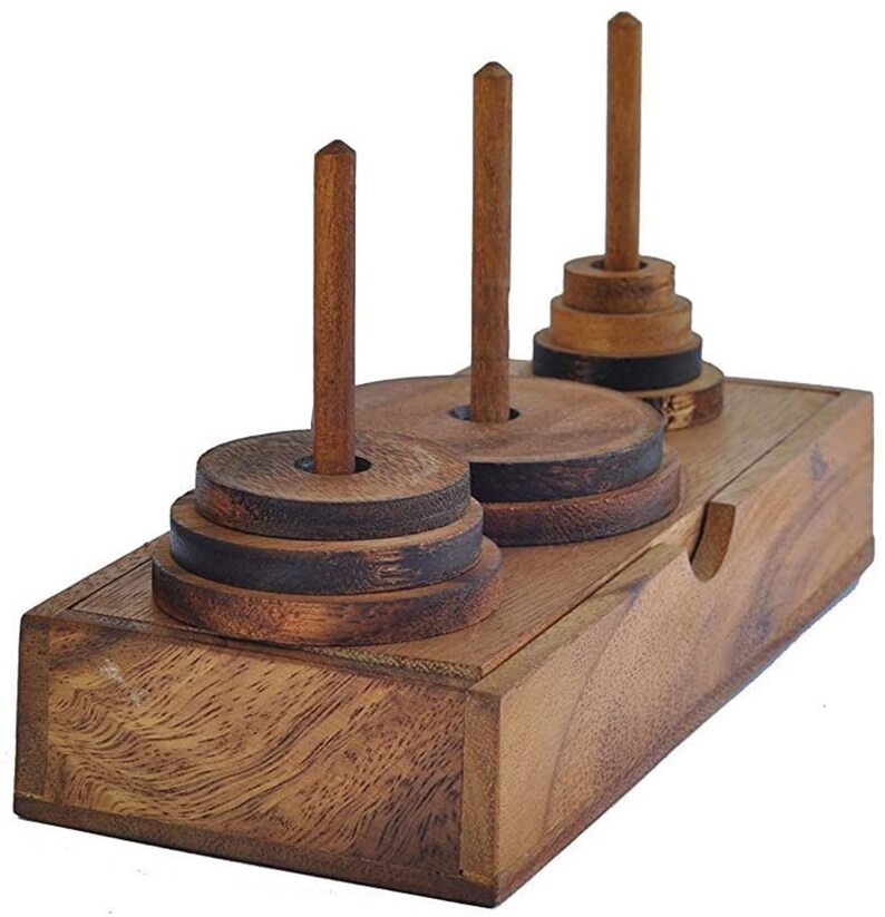 The object is to move nine graduated blocks of wood from a middle peg to one of the other two pegs, moving one block at a time and never place a larger block on top of smaller, all three pegs may be used