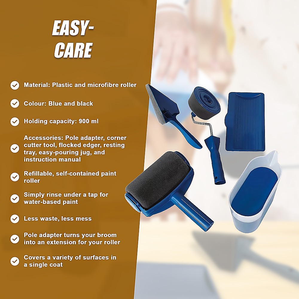 To use, just open up the roller and fill it with paint. Then, start painting! It's as simple as that. Its secret? Since the roller holds all the paint you need, you won't need to waste time dipping your roller in your tray. No worries about spills or splatters this innovative paint roller dispenses coatings evenly, making your paint job look like a professional's. Choose how thick you want the paint to coat your surface by pressing harder for a thicker coating, softer for a thinner coating. A pole adapter allows you to reach tall ceilings and high walls easily. A flocked edger allows you to paint around windowsills, light switches, plug sockets, and skirting boards with ease, while the corner cutter tool makes painting corners a breeze.