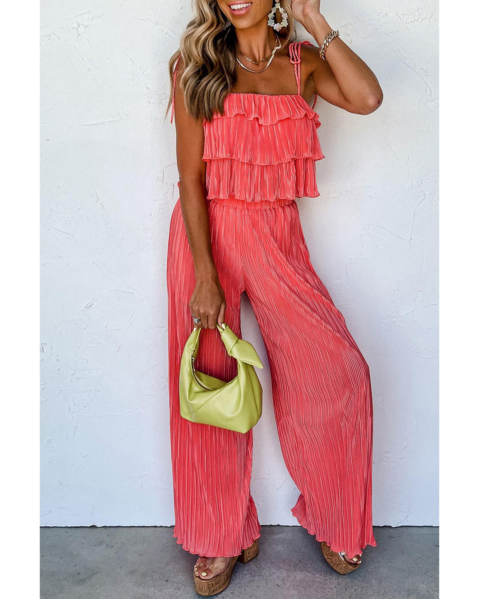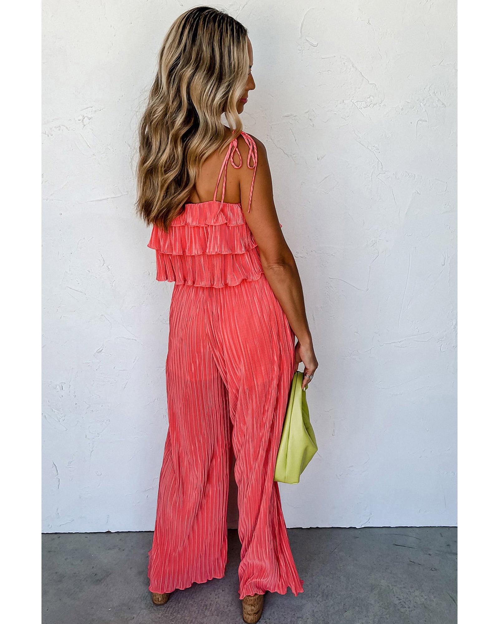 Pale Chestnut Ruffle Tiered Cami Pleated Wide Leg Pants Set – L