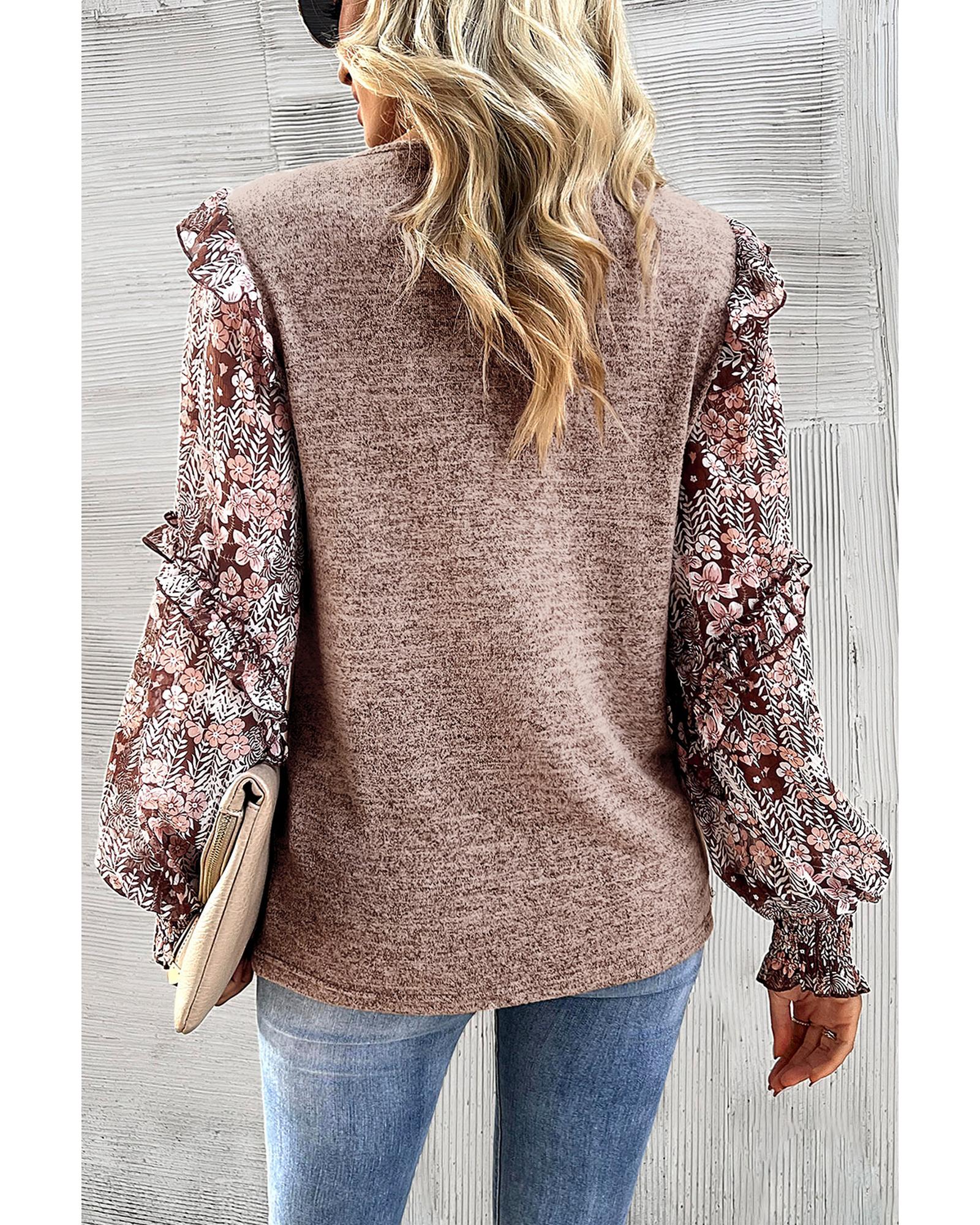 Pale Chestnut Ruffle Tiered Floral Sleeve Crew Neck Blouse – L
