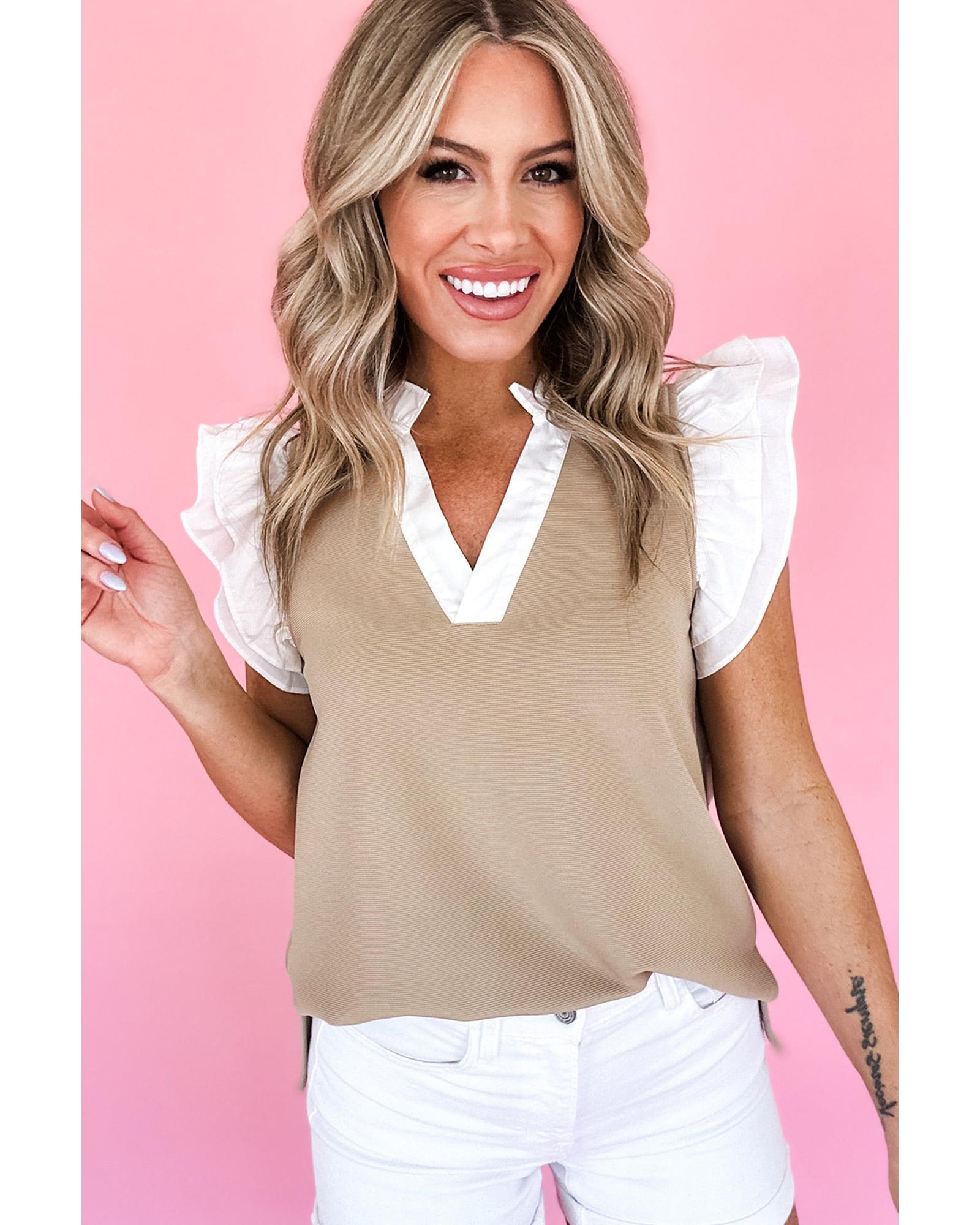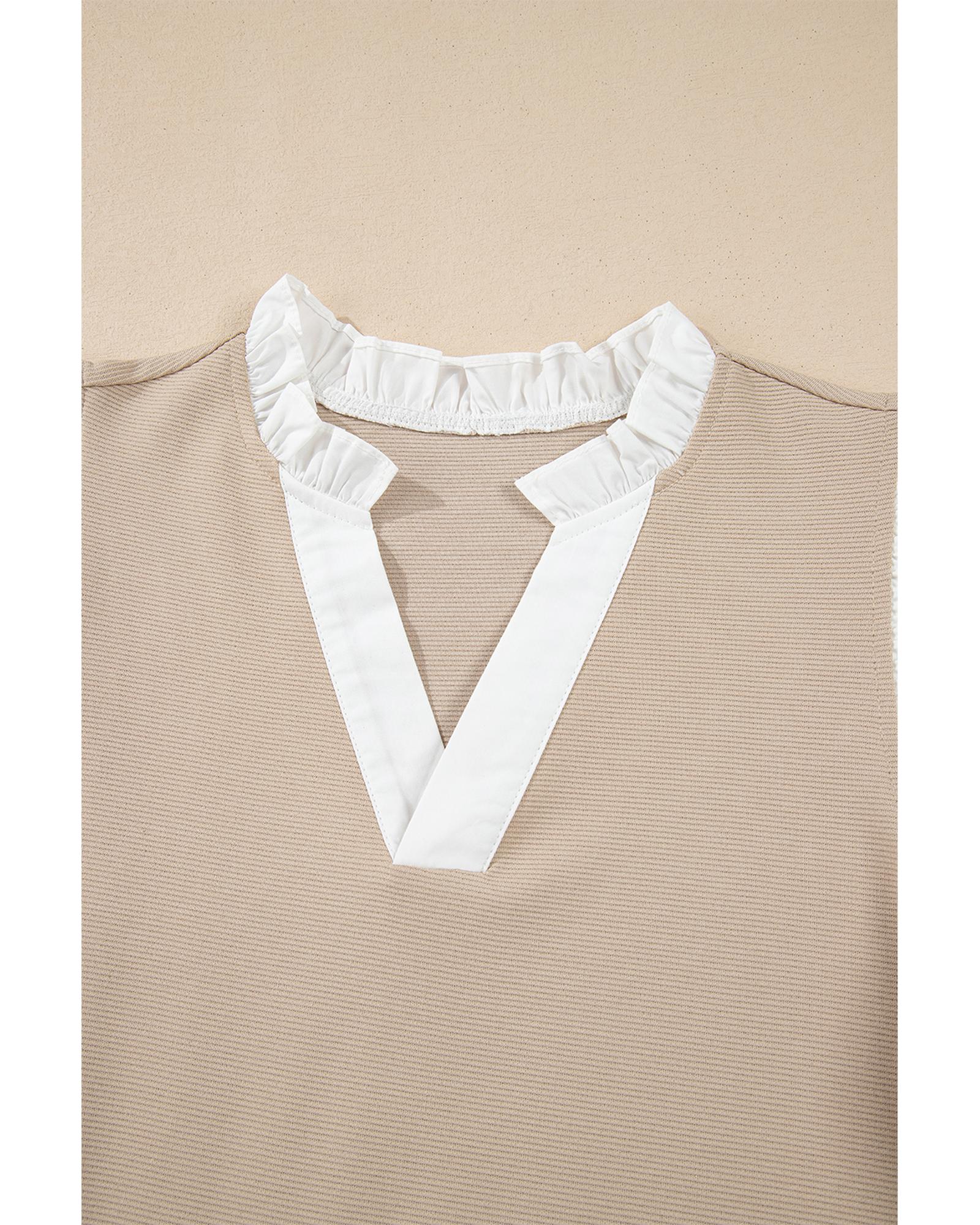 Pale Khaki Contrast V Neck Ruffled Textured Knit Top – M