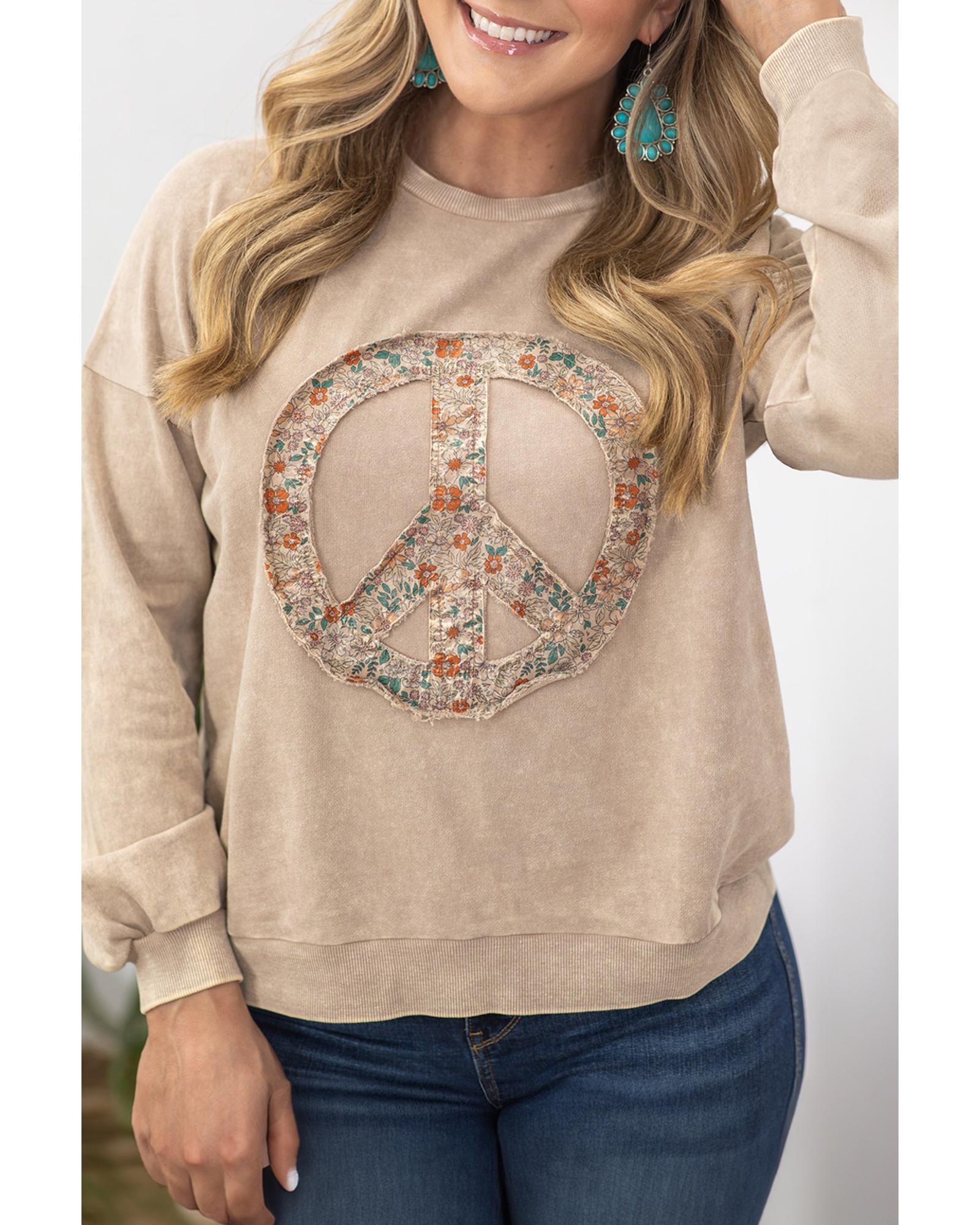 Pale Khaki Floral Peace Sign Graphic Washed Terry Plus Size Sweatshirt – 4X