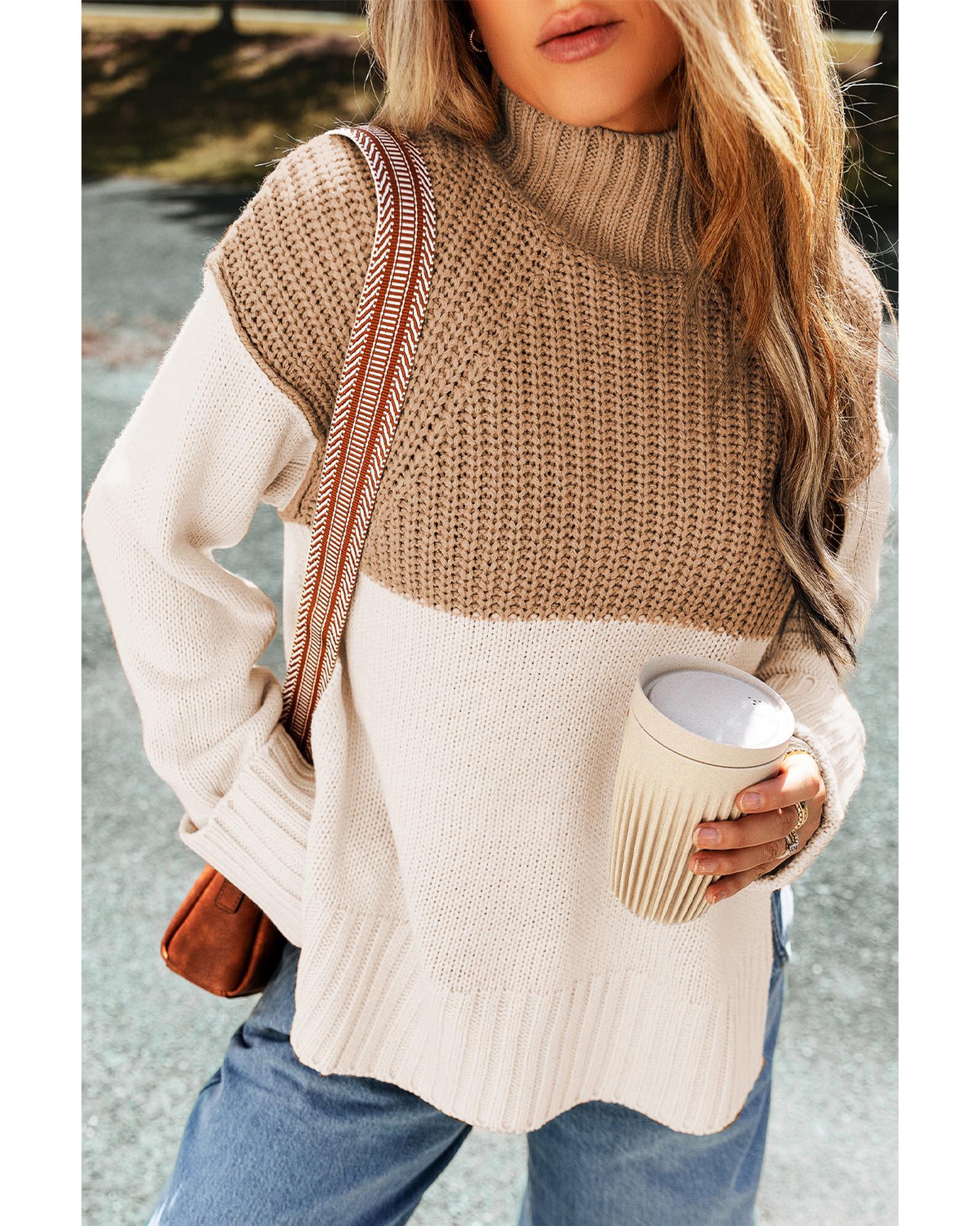 - forward Parchment Cable Knit Color Block Side Splits High Neck Sweater