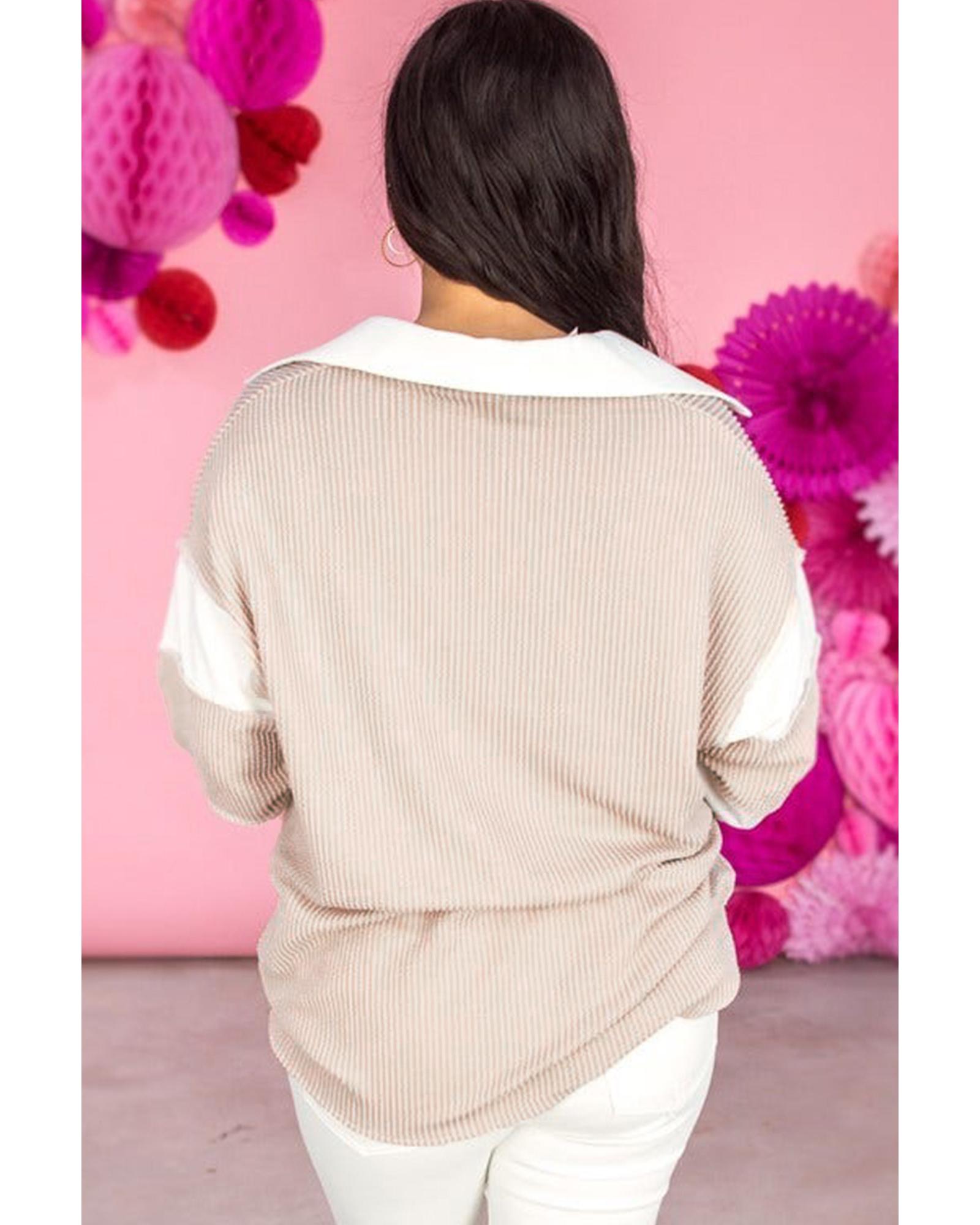 Parchment Corded Colorblock Long Sleeve Slit V Neck Plus Top – 2X