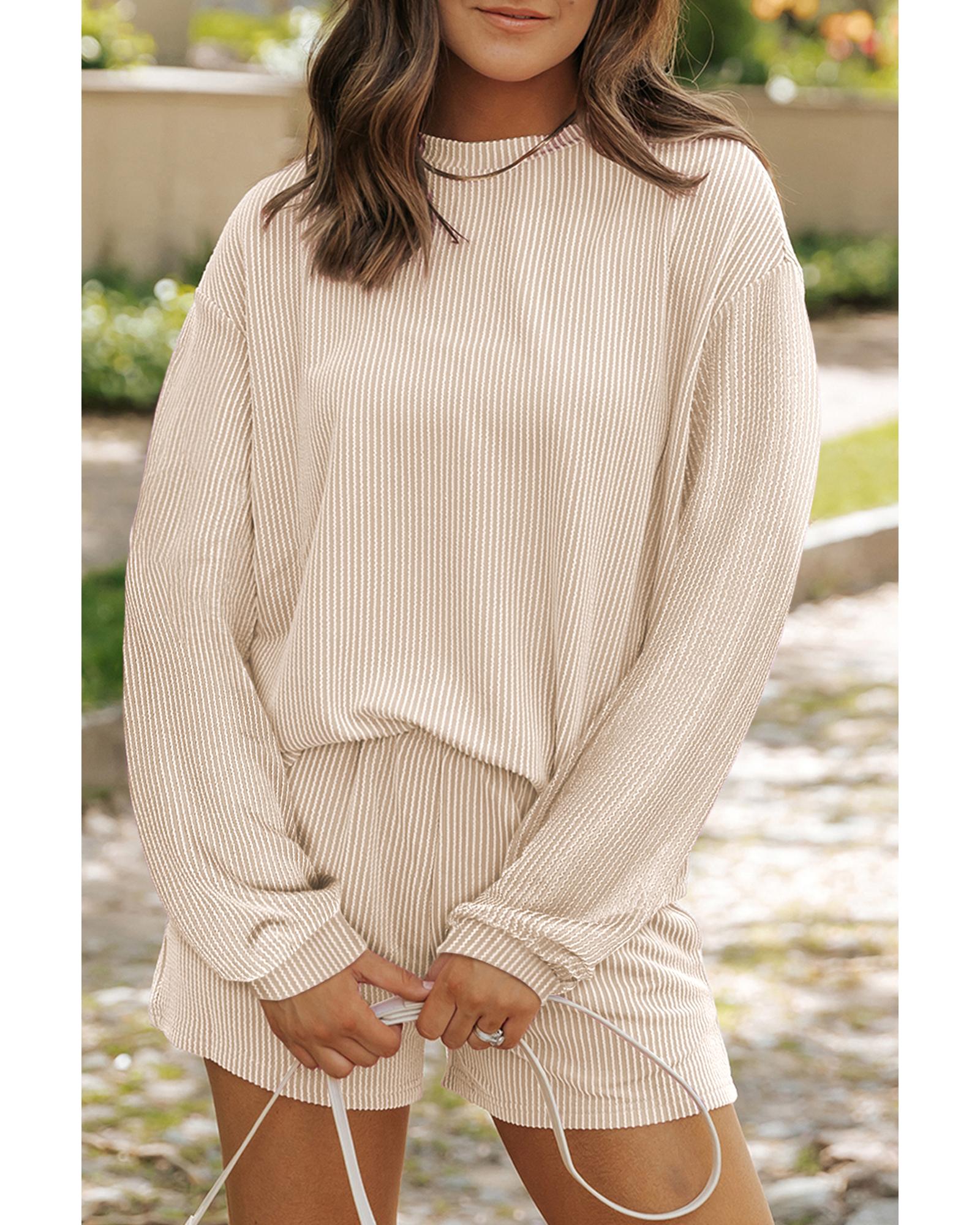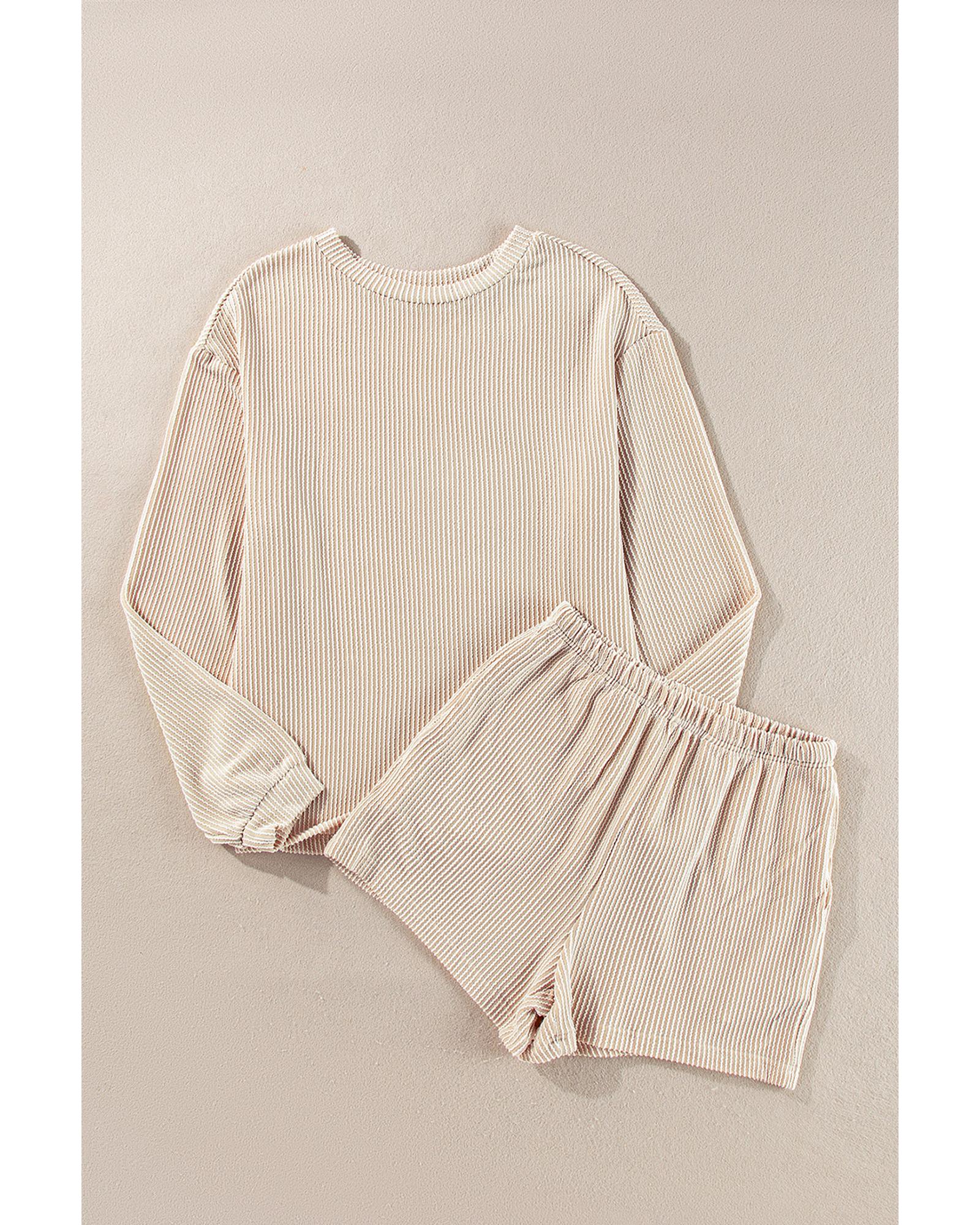 Parchment Corded Knit Long Sleeve Top and High Waist Shorts Set – L
