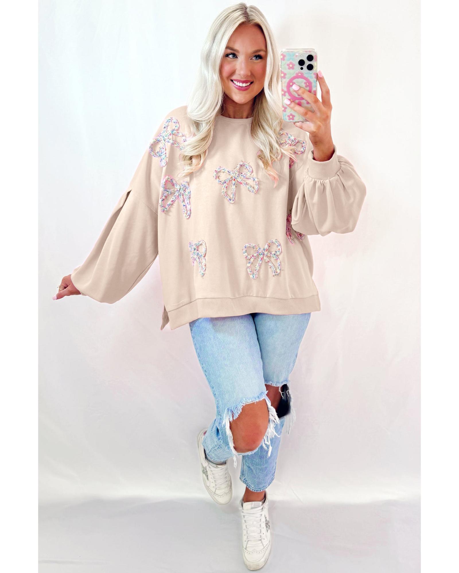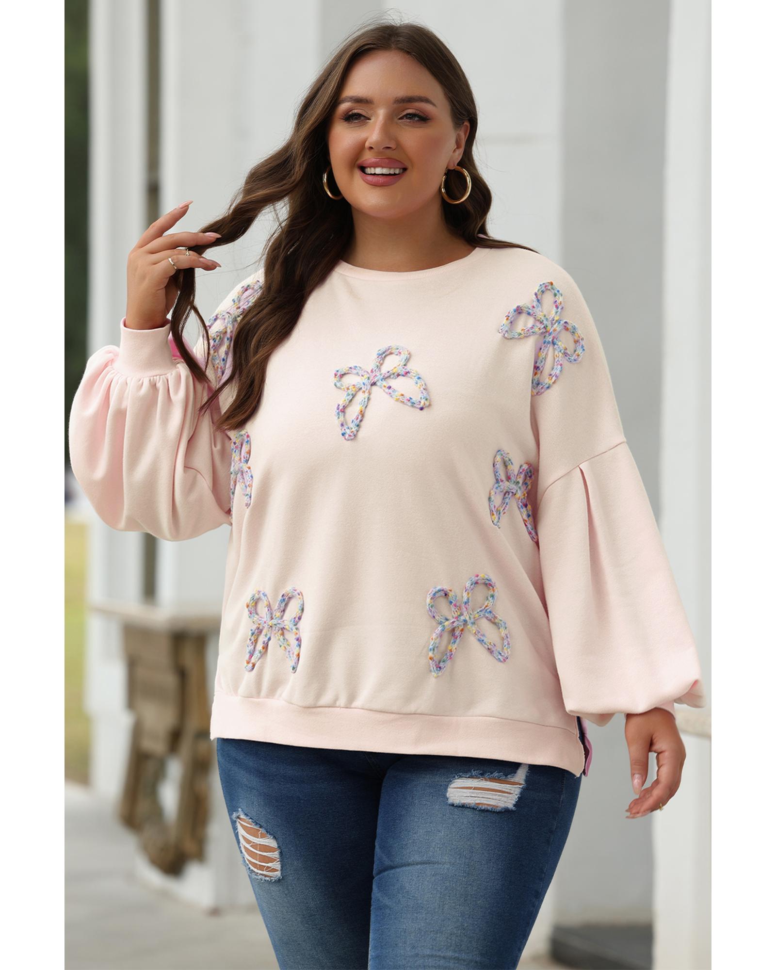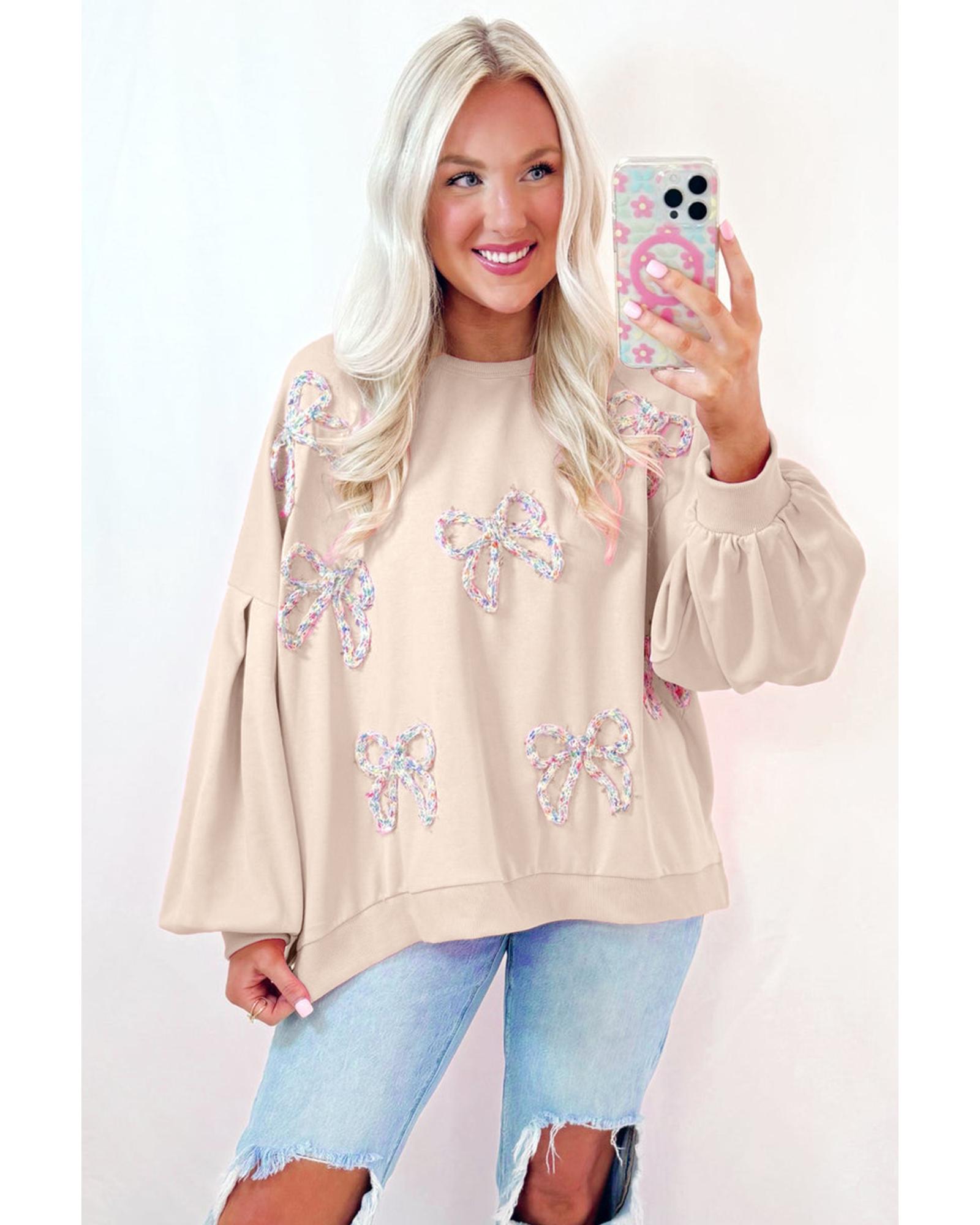 Parchment Embroidered Bow Lantern Sleeve Oversized Pullover Sweatshirt – M