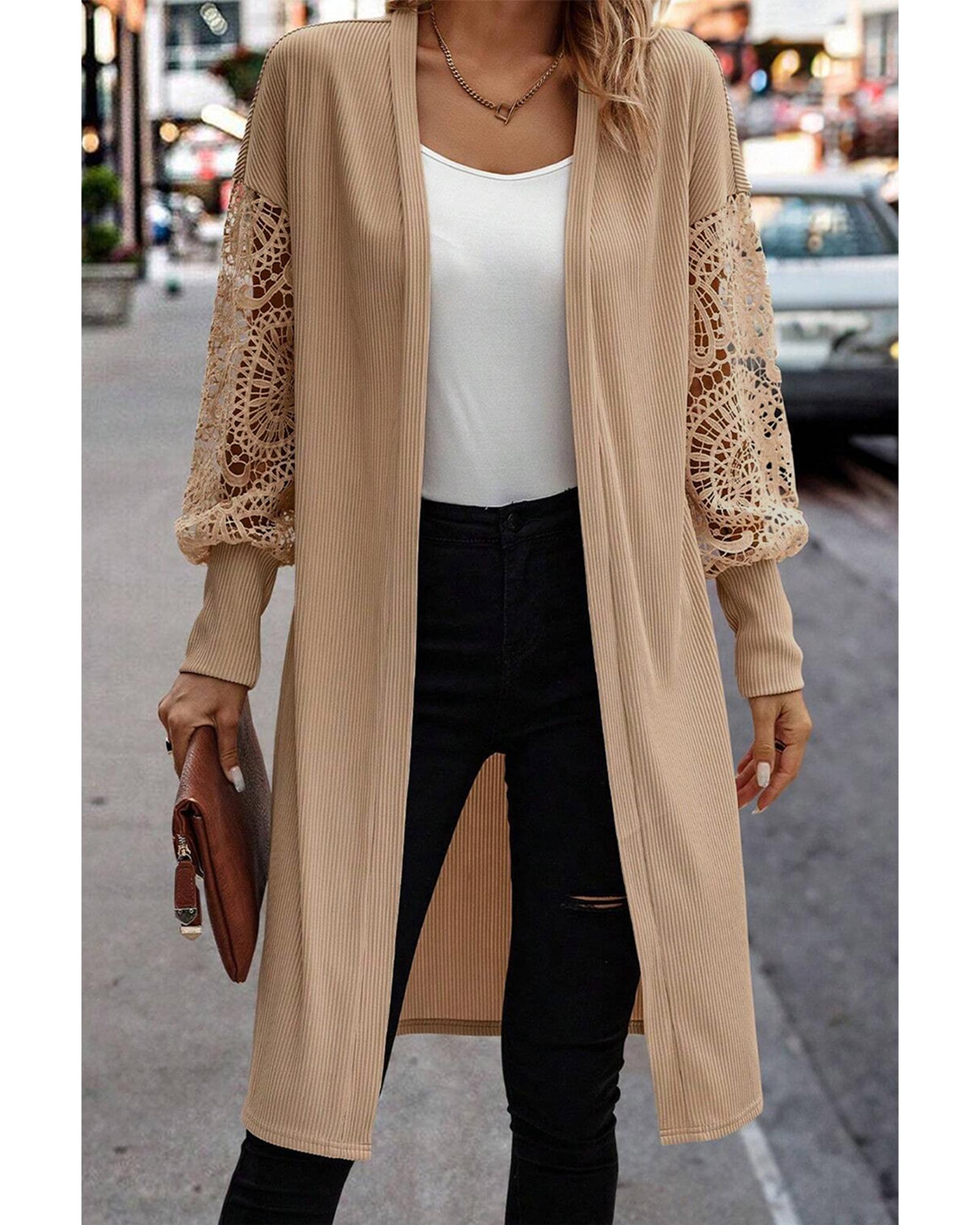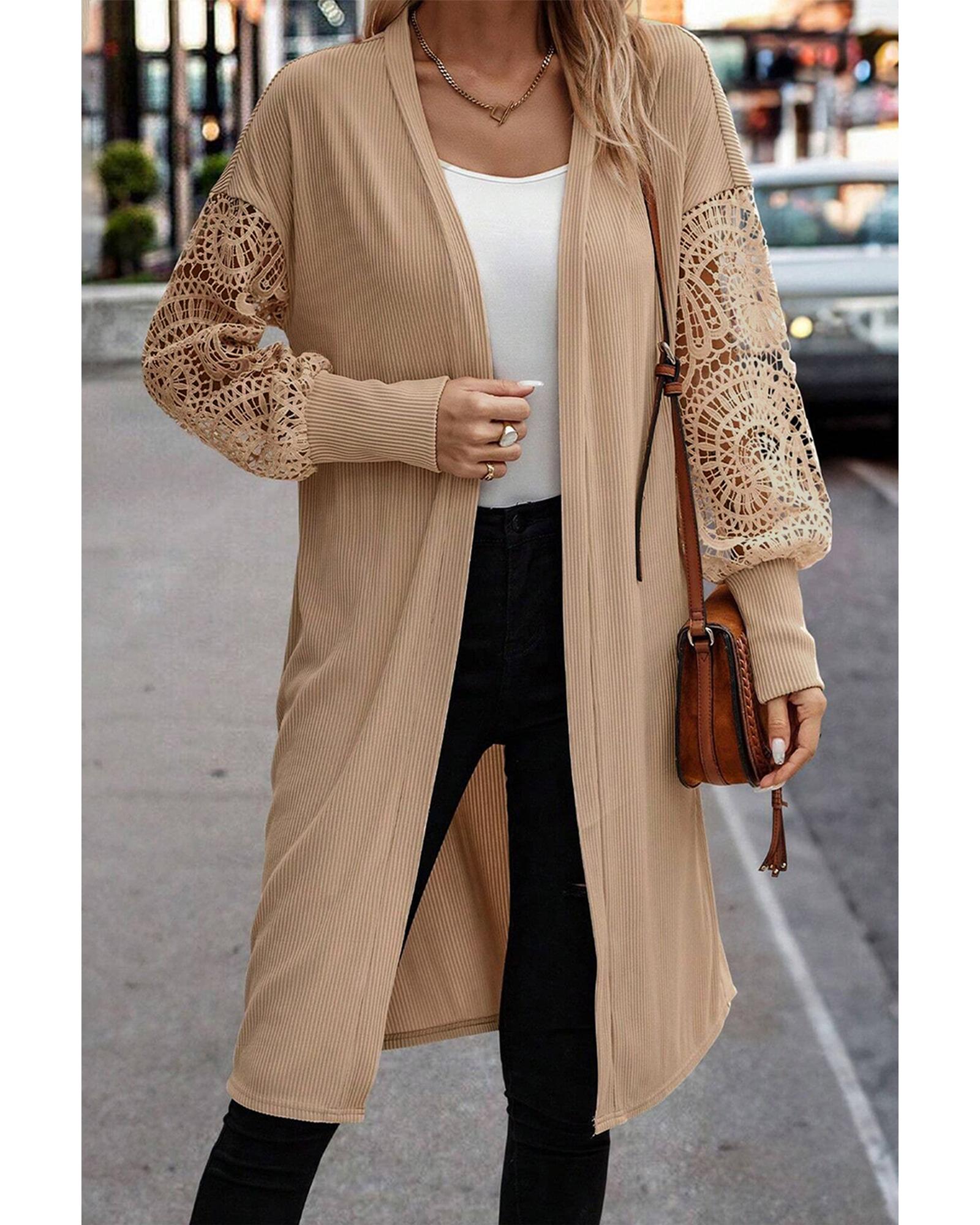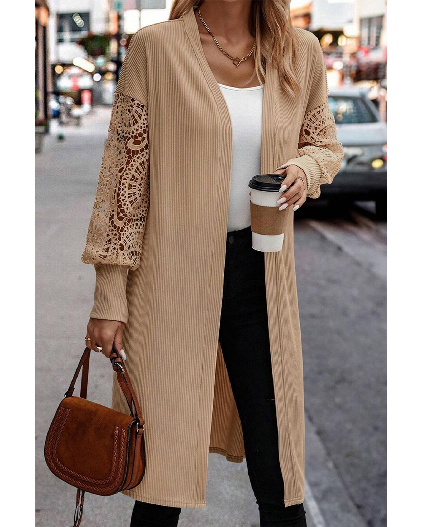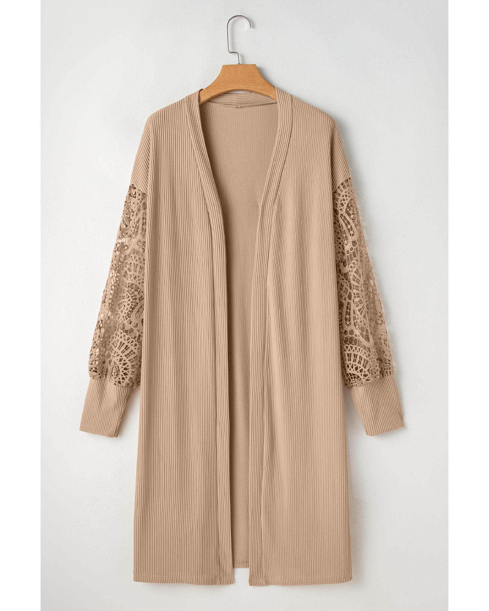 Parchment Lace Patchwork Ribbed Knit Open Front Duster Cardigan – L