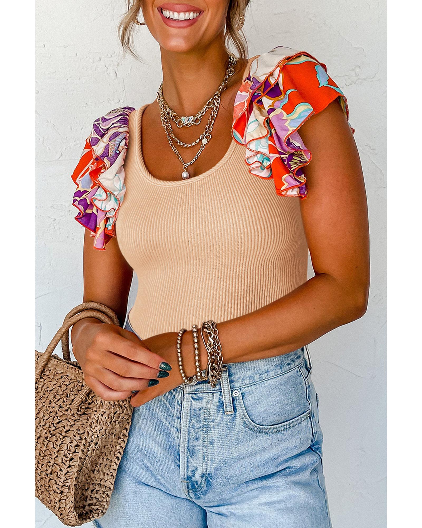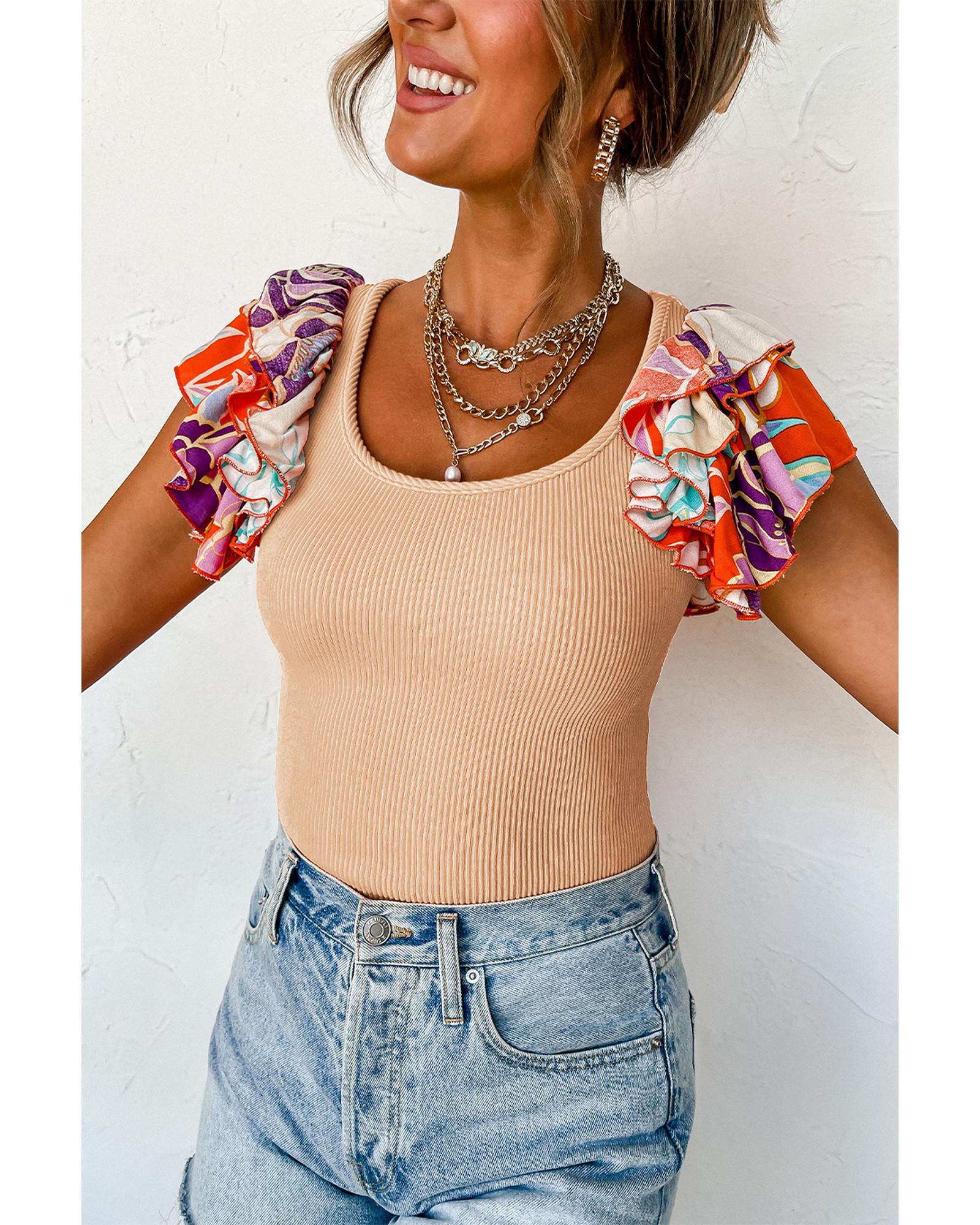 - Tiered ruffled sleeve design adds a touch of femininity