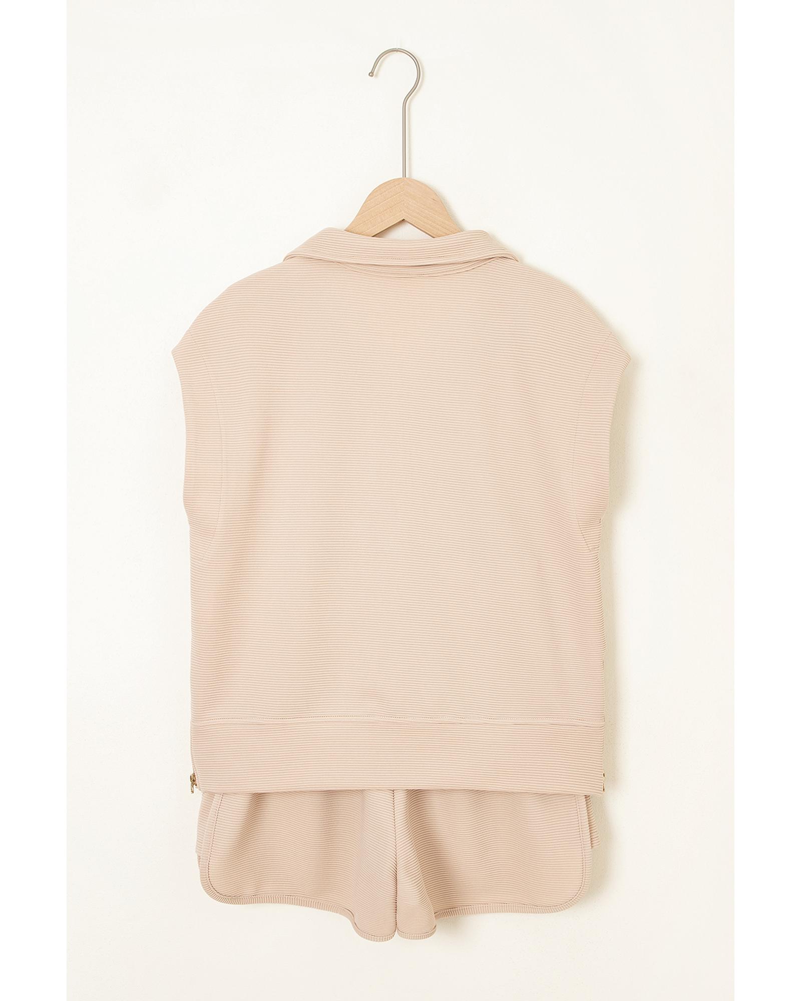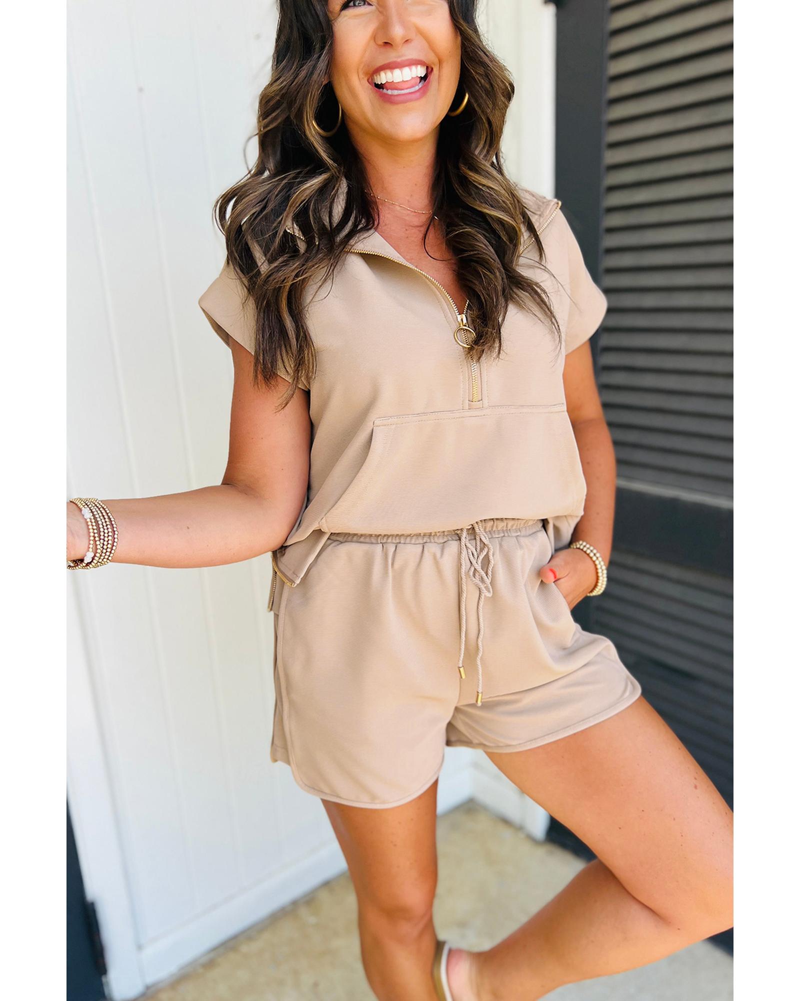 Parchment Textured Half Zip Kangaroo Pocket Top Drawstring Shorts Set – L