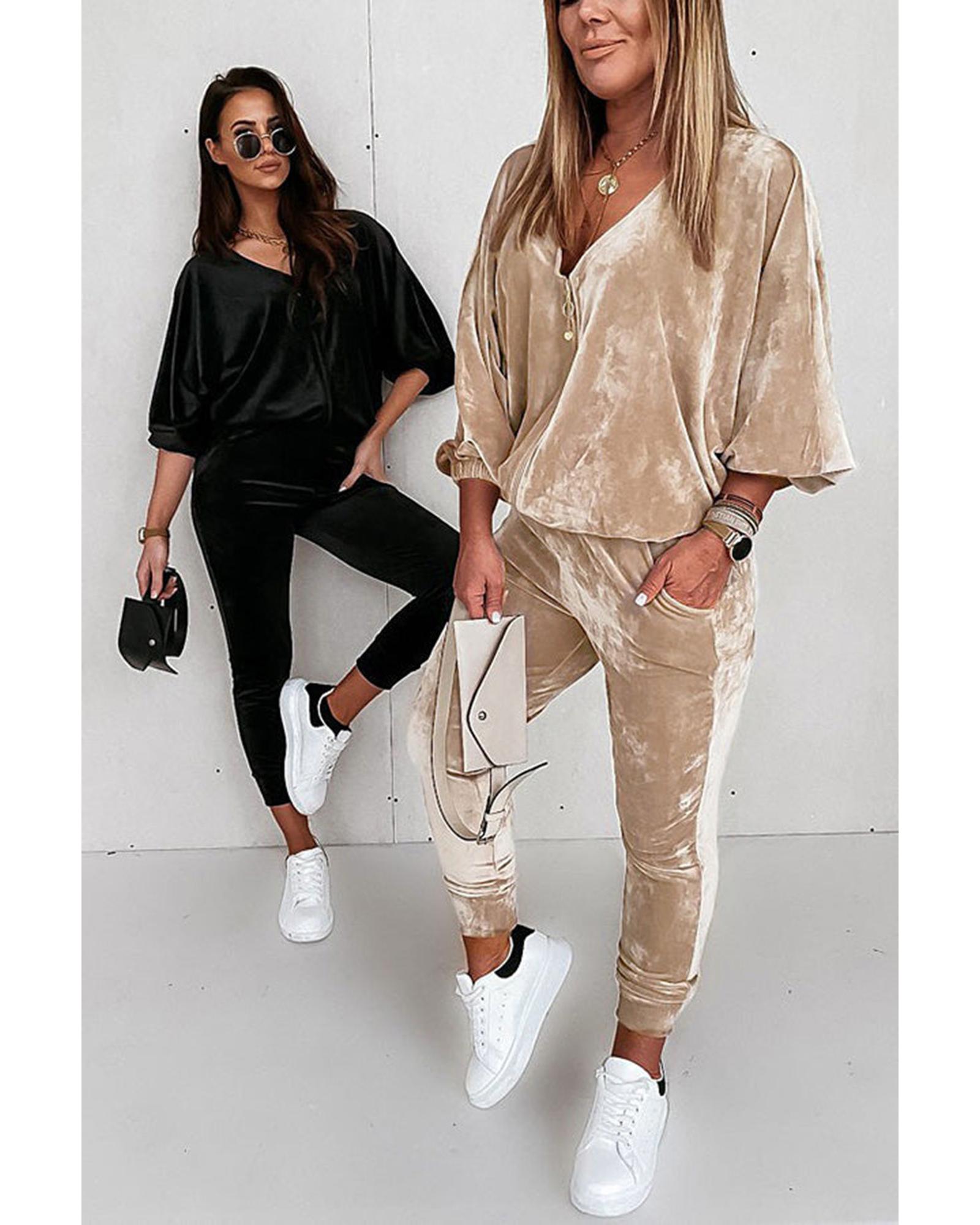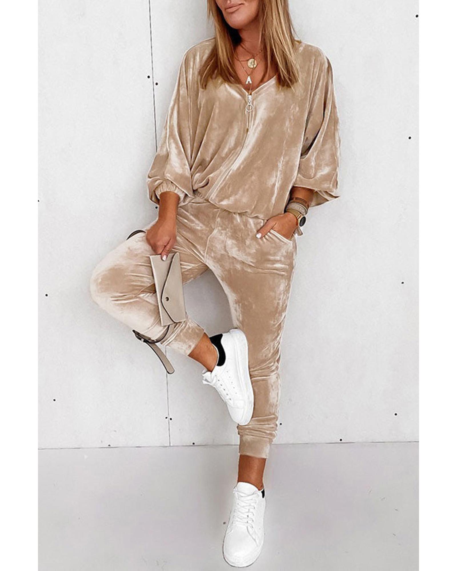 - Parchment Velvet Zipped Top and Joggers Two Piece Set