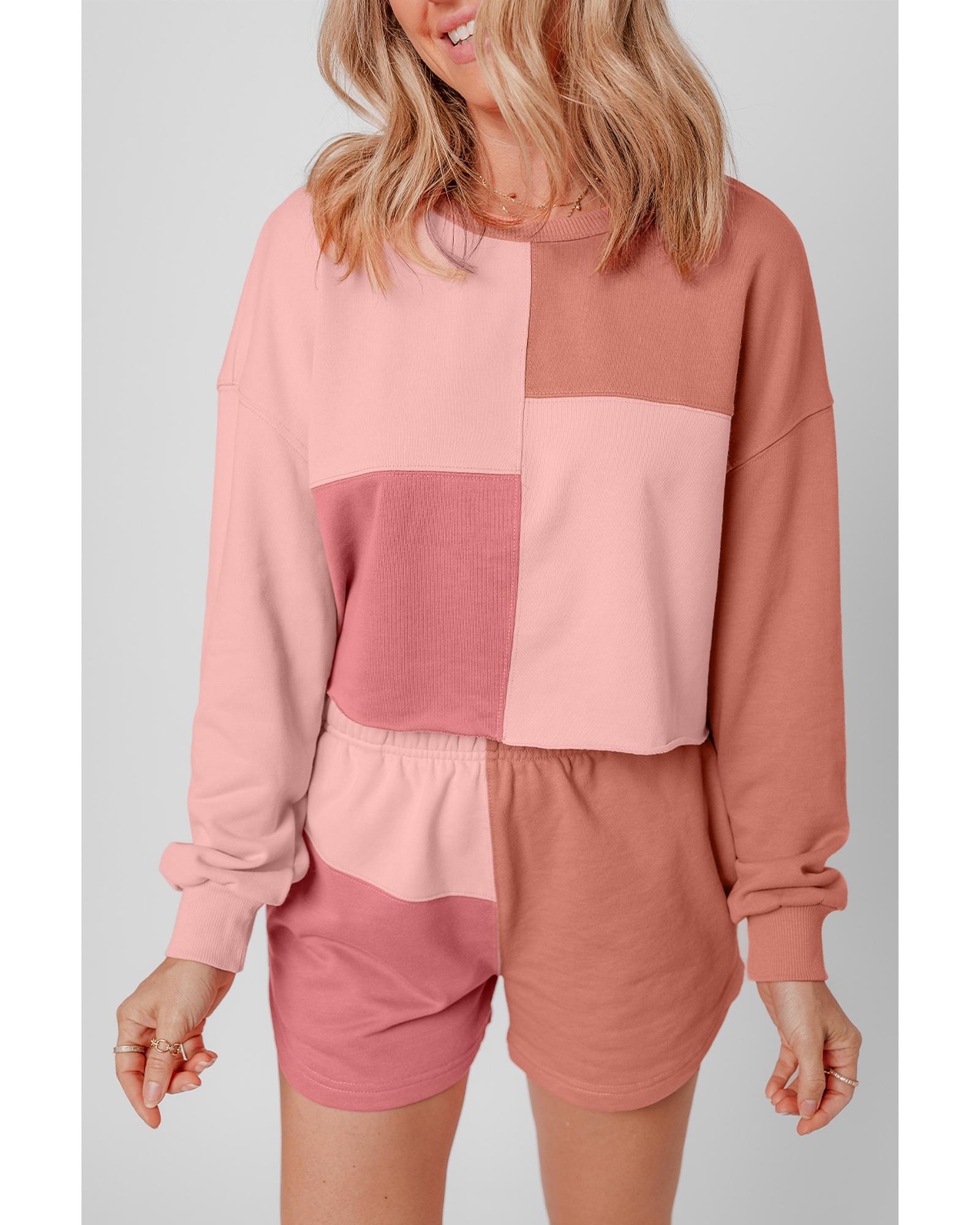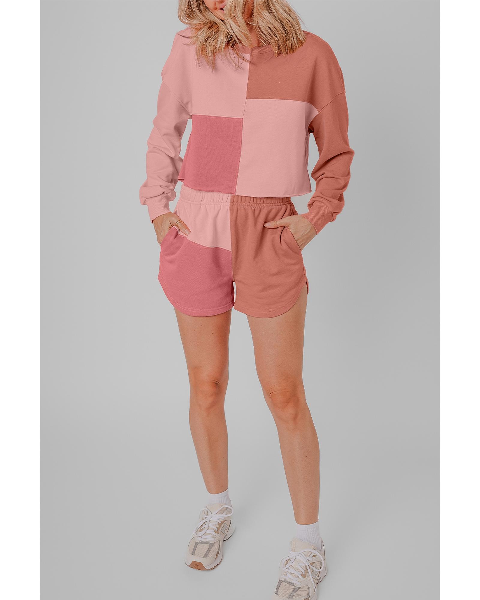 Peach Blossom Colorblock Patchwork Long Sleeve Shorts Outfit - S