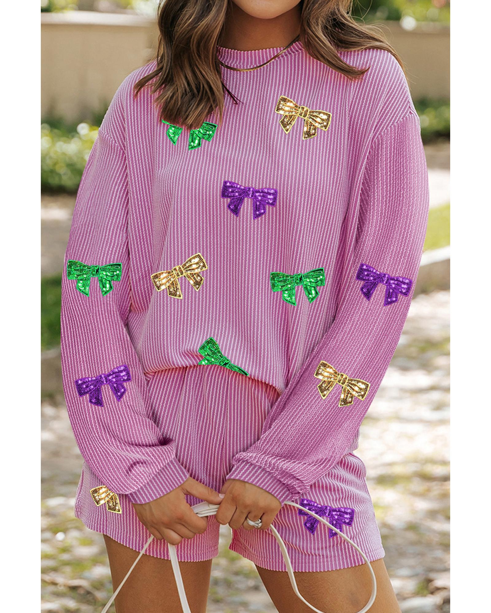 Phalaenopsis Bowknot Patched Pattern Corded Long Sleeve Top and Shorts Outfit – XL