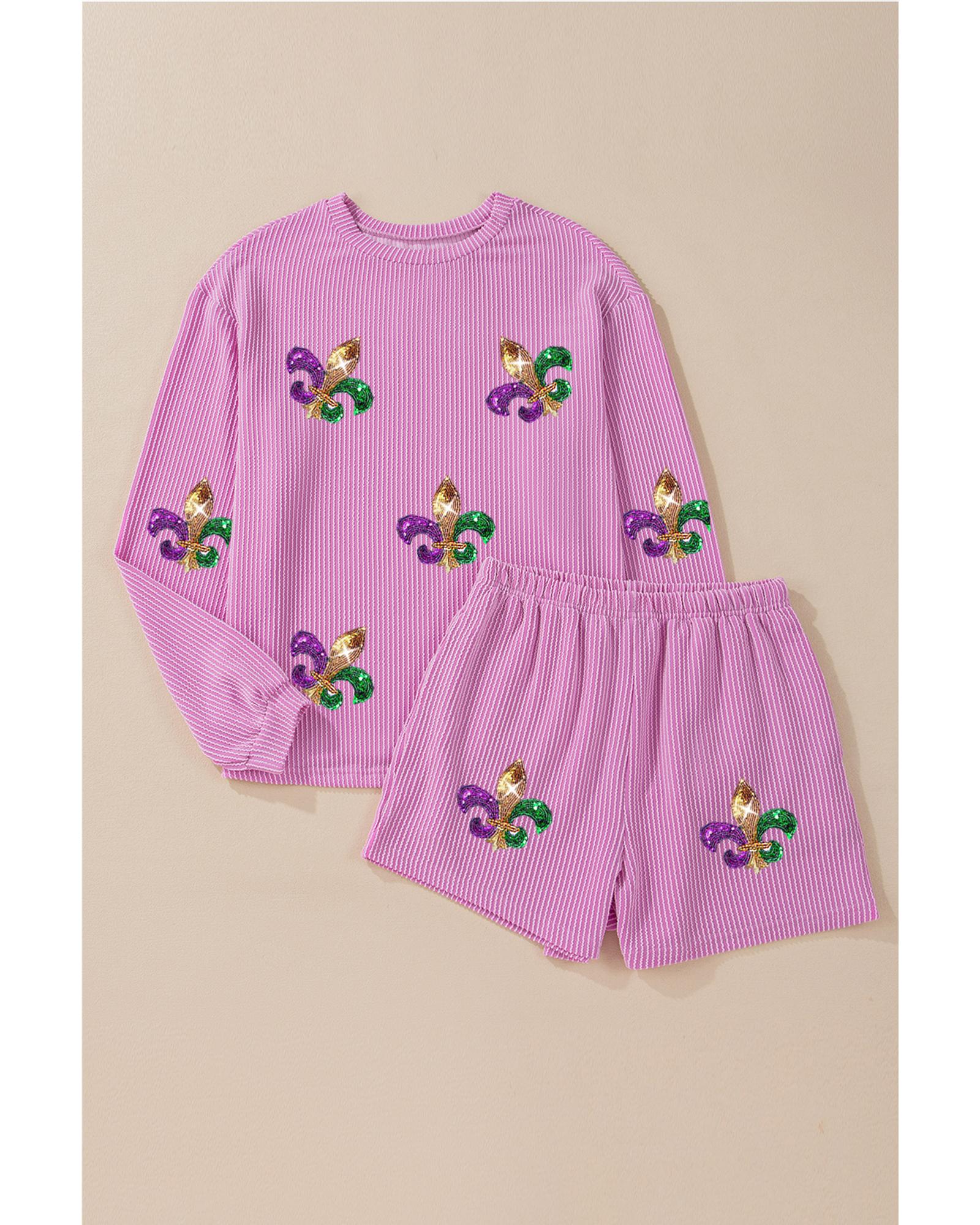 Phalaenopsis Mardi Gras Fleur de Lis Patched Corded Long Sleeve Top and Shorts – S