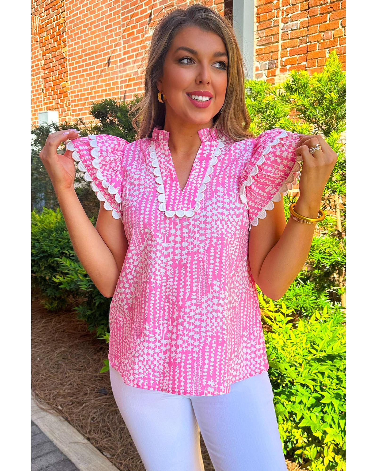 Pink Abstract Print Ric Rac Trim Flutter Sleeve Notch V Neck Blouse – M